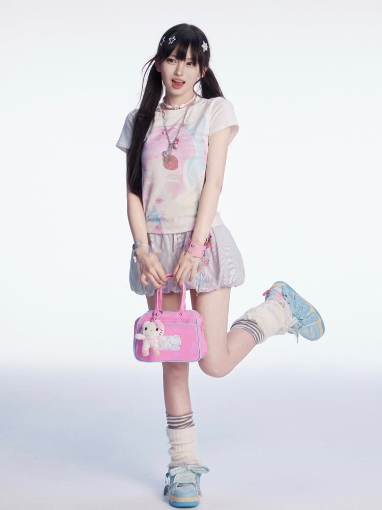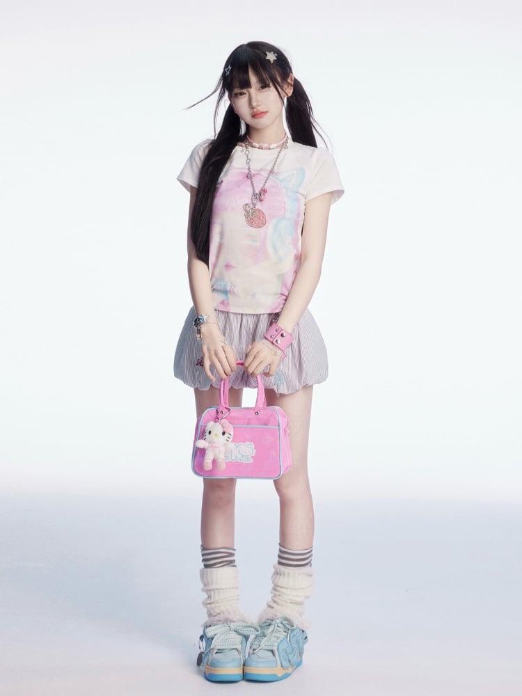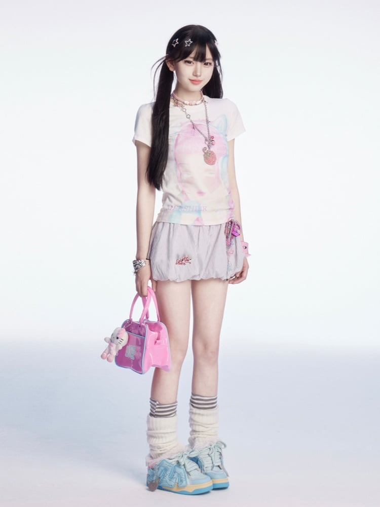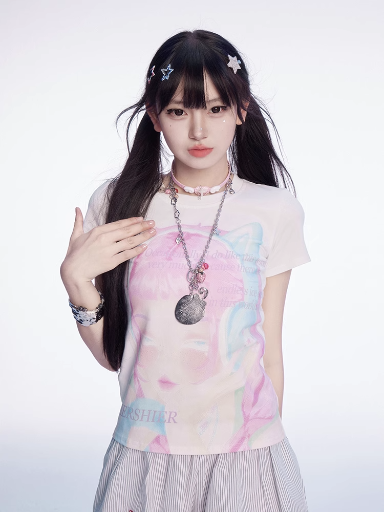Y2K 漫画ガールプリント ホワイト ラウンドネック スリムフィット Tシャツ