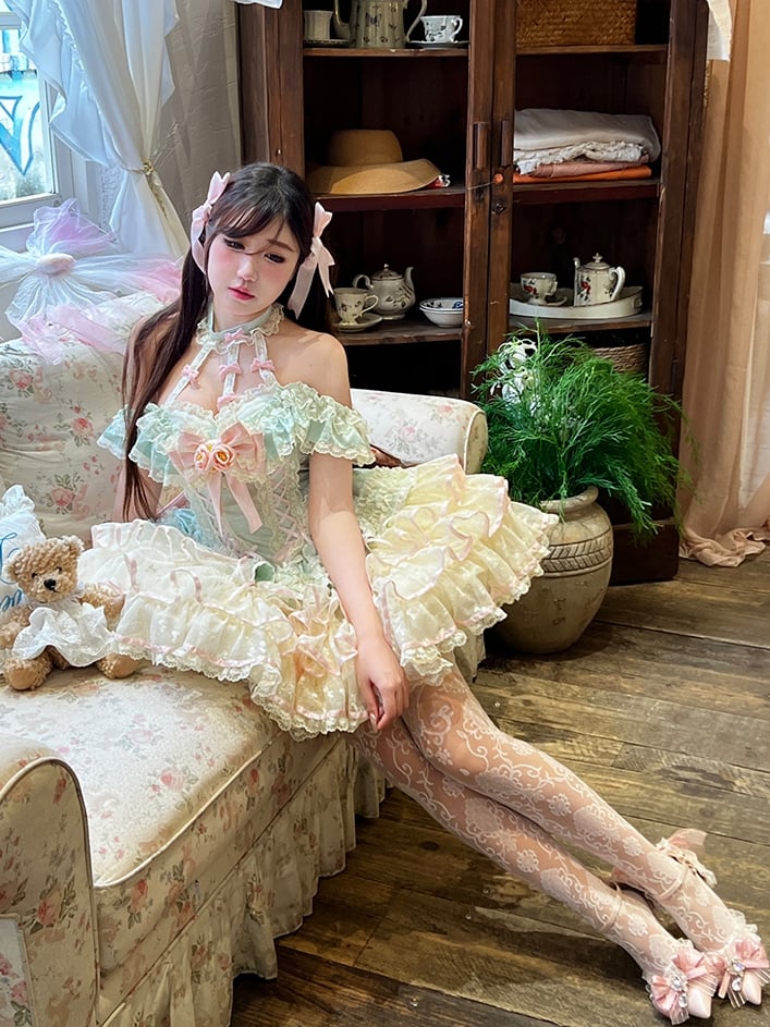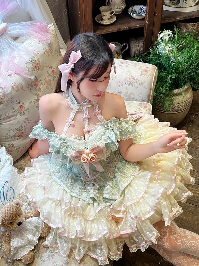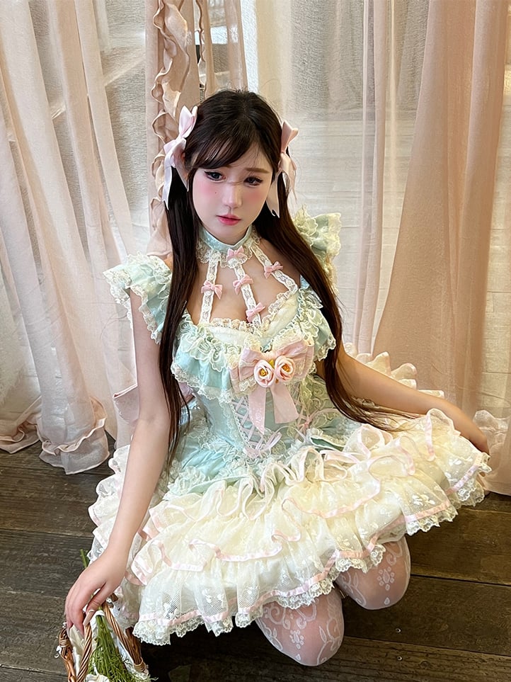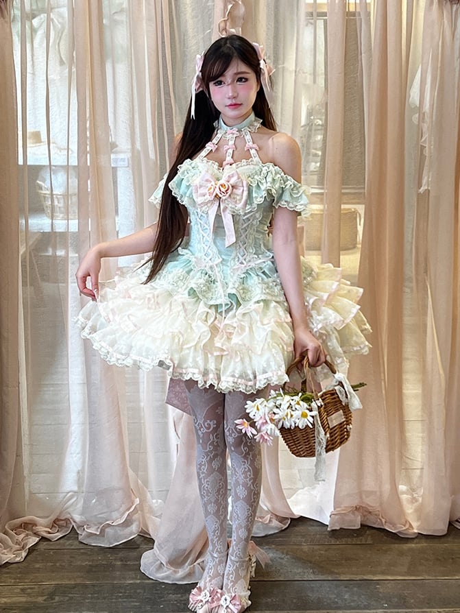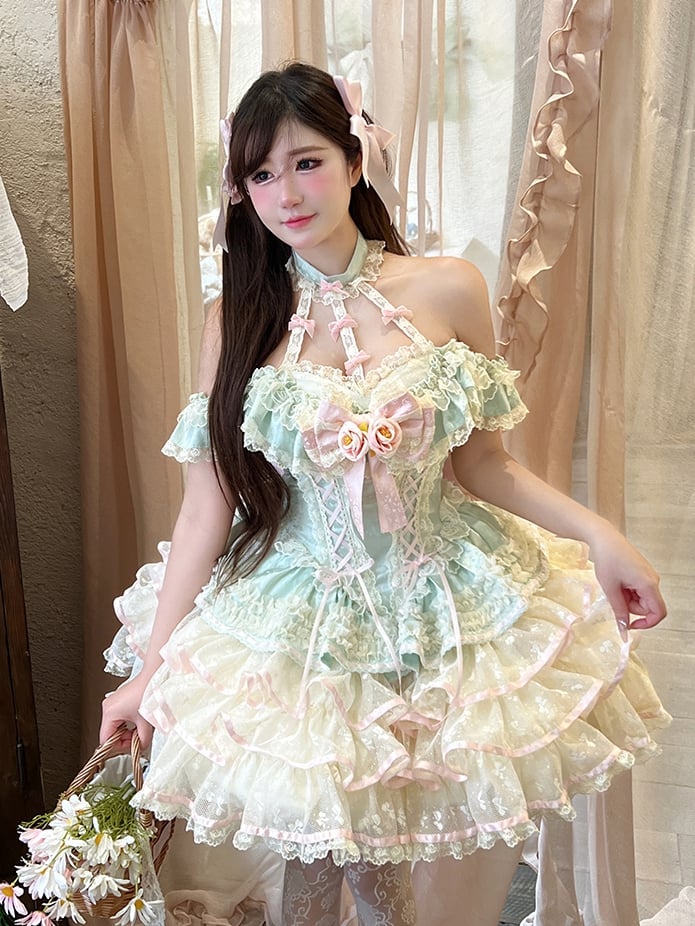 ティアードスカート ホルターネック 妖精フリルネック コルセット レース プリンセスドレス ウエスト ミントグリーン