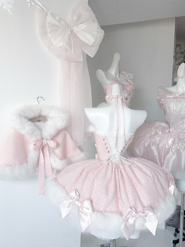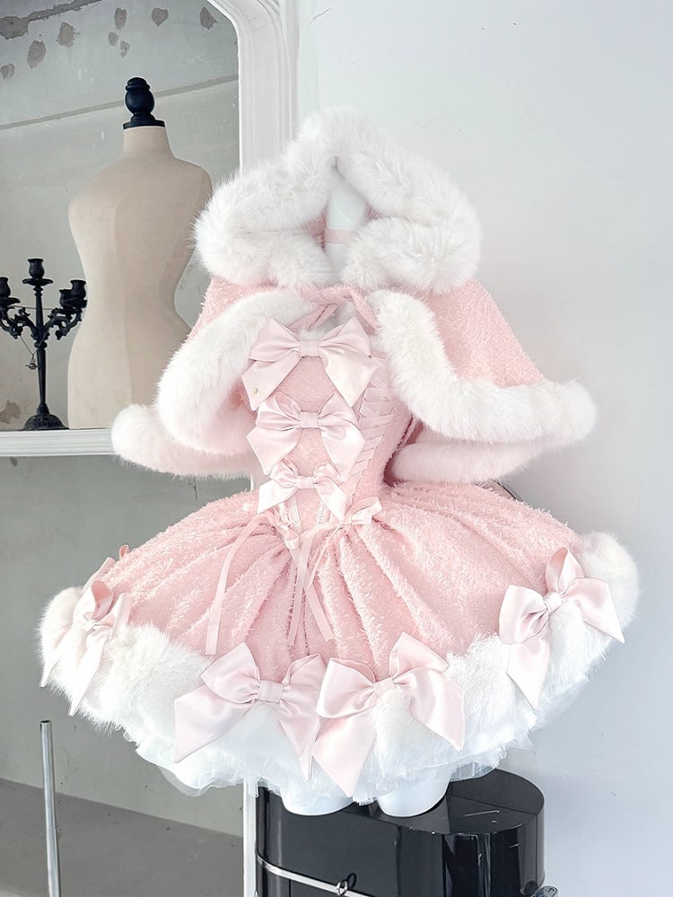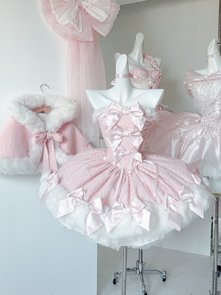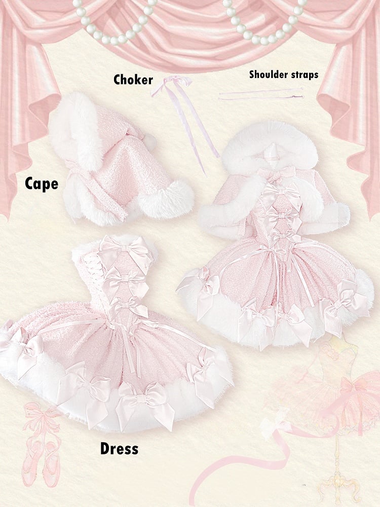 バレンタインデーのピンクのリボンが豪華なネックラインと裾のボーン入りドレス + ケープフルセット