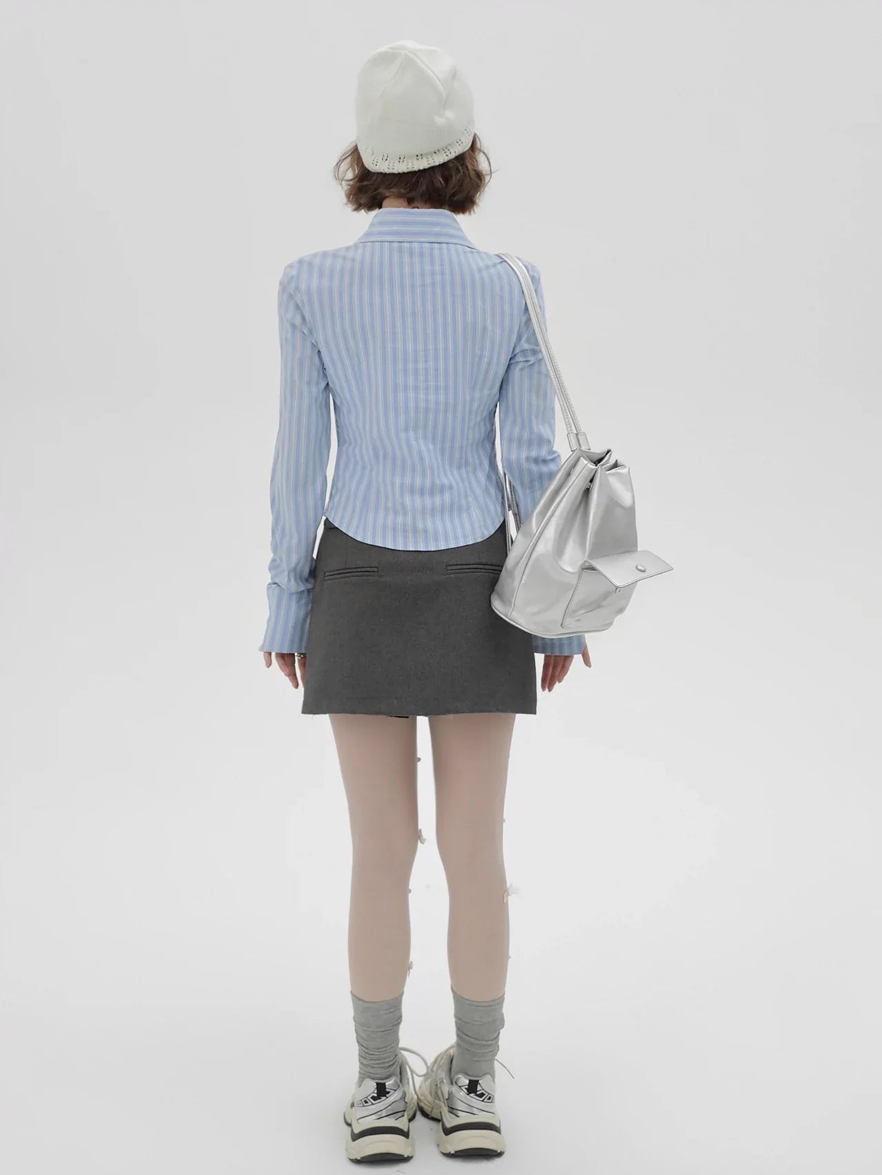 スリムなブルーのVネックシャツは、魅力的なストライプデザインが特徴です。個性的なVネックがキュートな雰囲気を添え、ネックラインを長く見せてくれます。ワードローブの定番アイテムとして、このシャツを着て、見た目も着心地も最高に素敵に。