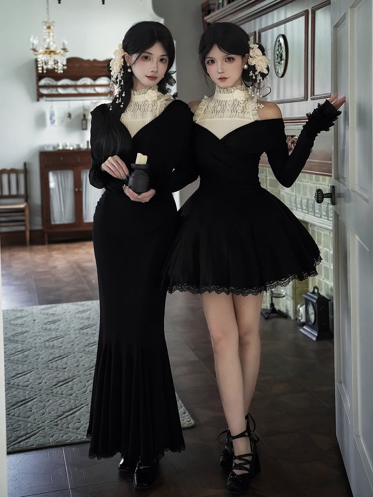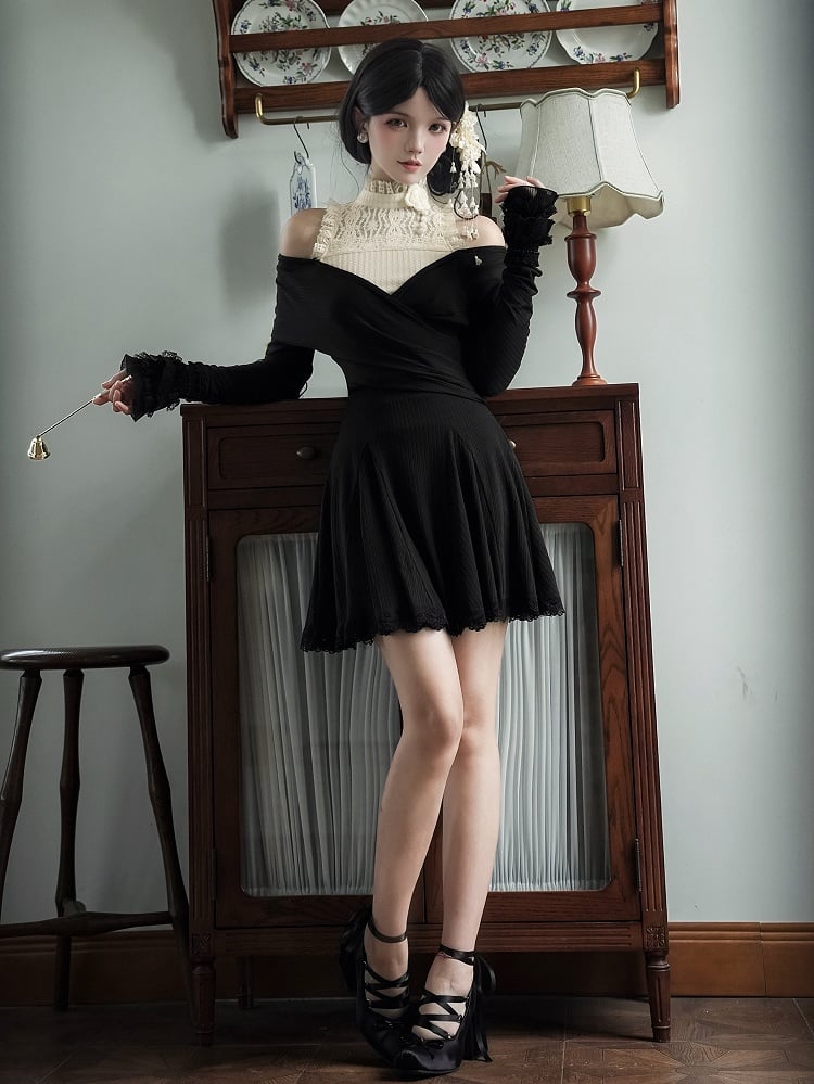 Deep V-Neck Black Long Sleeves Knit Short Dress + Beige Sleeveless Top + Flower Hairclip