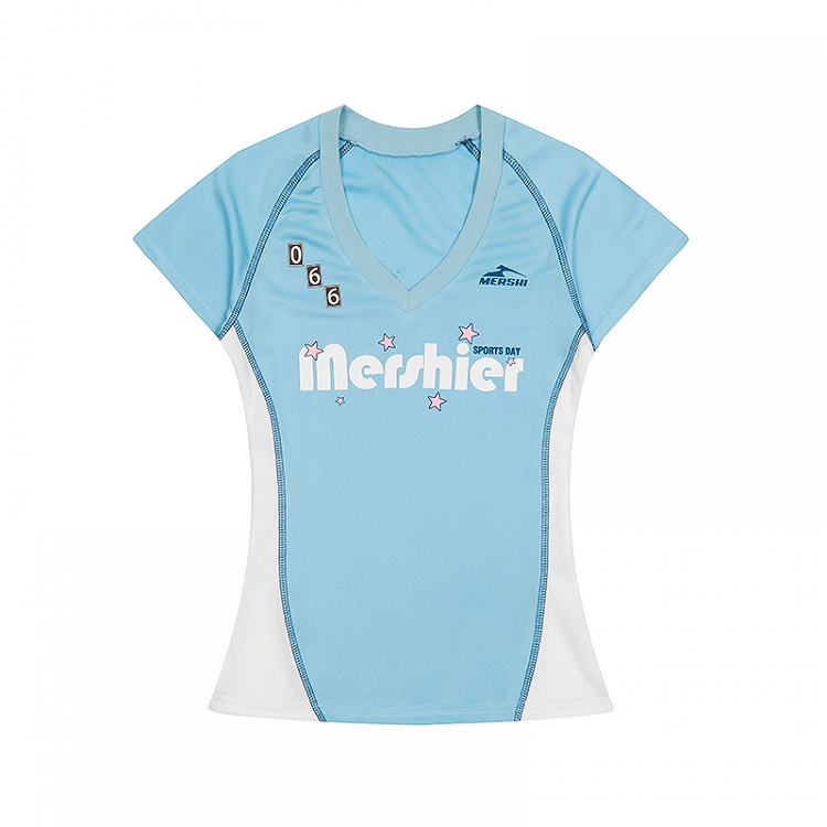 Vネック スリムフィットTシャツ ブルー&ホワイト カラーブロックデザイン