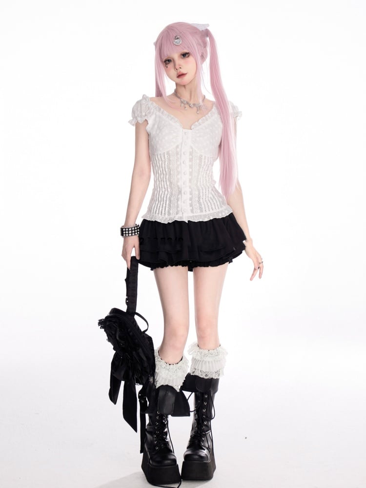 VネックTシャツ ホワイト オフショルダー ネックライン パフスリーブ スイート
