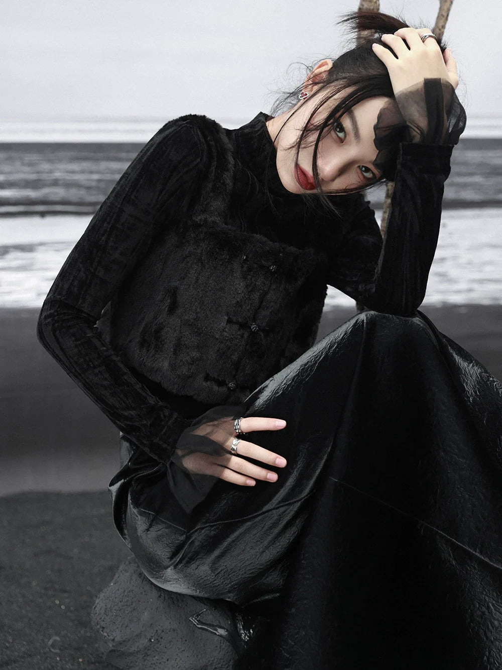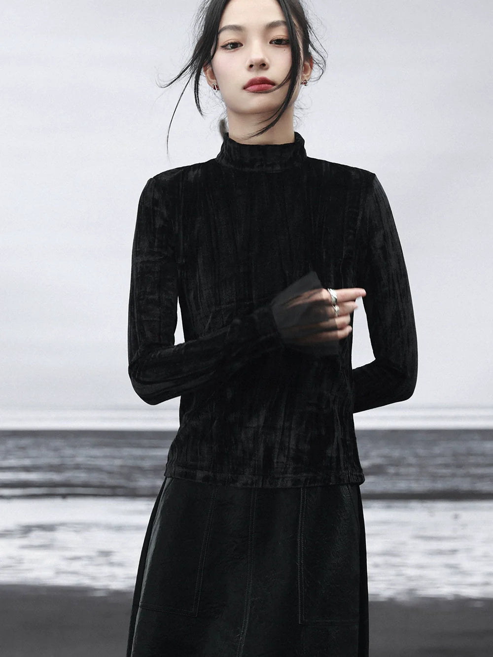 ベルベットダークタートルネックスプライシングシャツメッシュレトロ