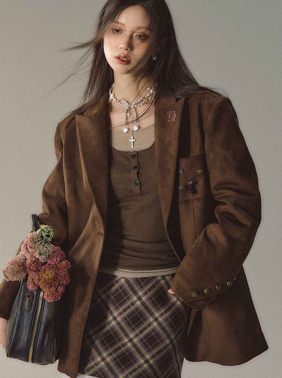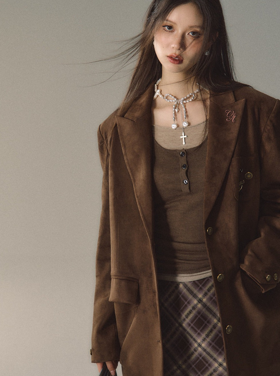このキュートなスーツは、柔らかなベルベット仕上げとスタイリッシュなフェイクスエードジャケットが特徴です。ワードローブに欠かせないこのアイテムで、暖かくトレンド感あふれる装いを演出しましょう。