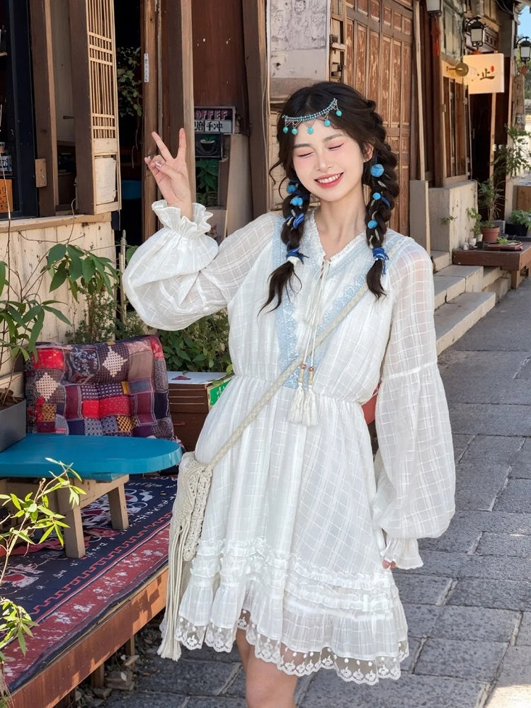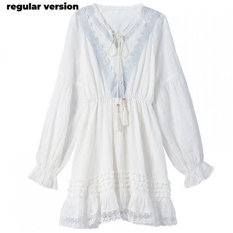 ホワイトVネックレーストリムドレス(タッセルドローストリングデザイン)レギュラー/ロングバージョン