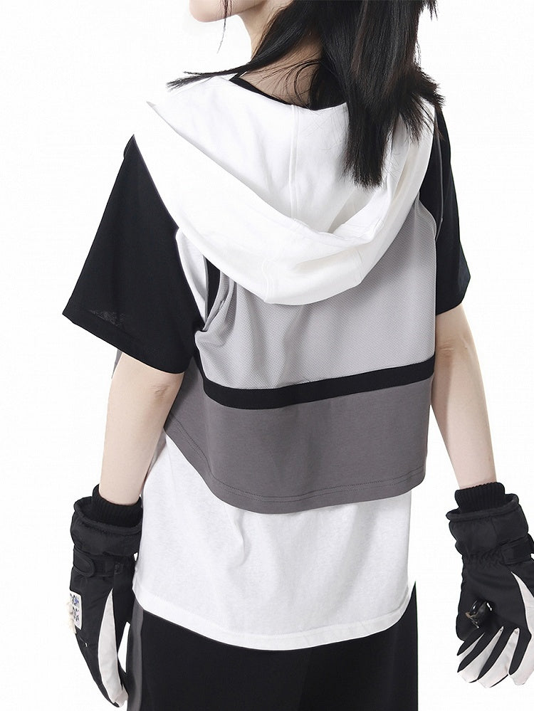 ベスト グレー カラーブロック デザイン テックウェア フード付き クロップド
