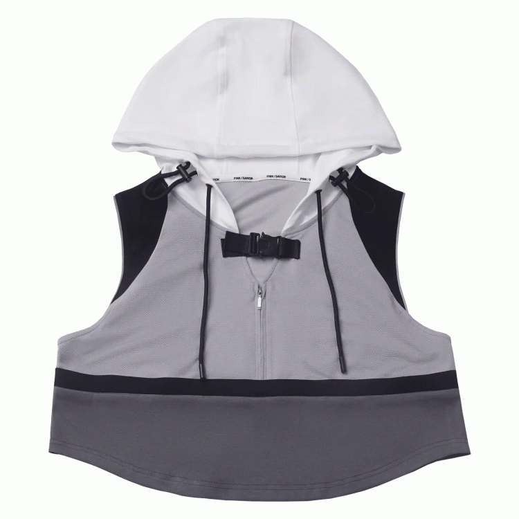 グレーのカラーブロックデザイン テックウェア フード付きクロップドベスト