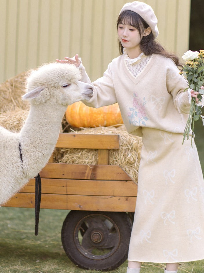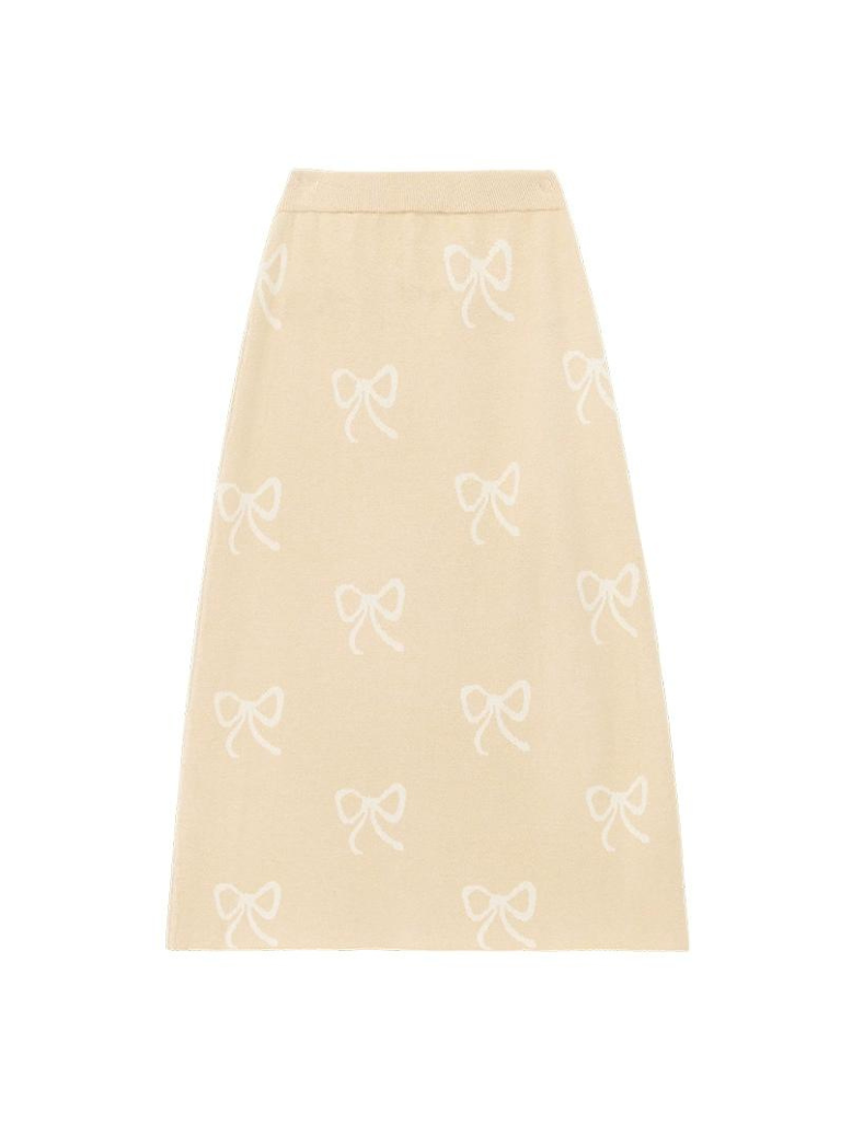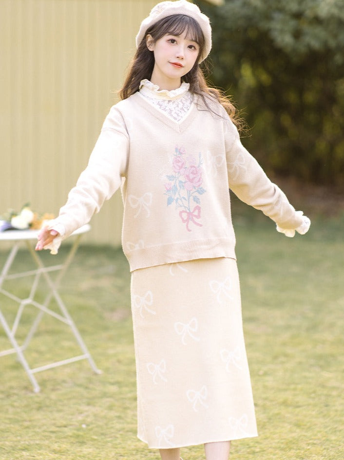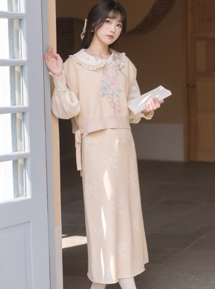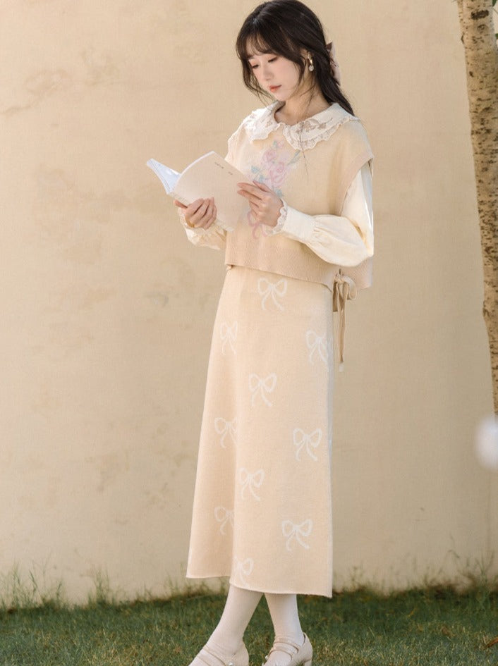 ベストスカートセーター + イエロージャカードニット + リボンニット