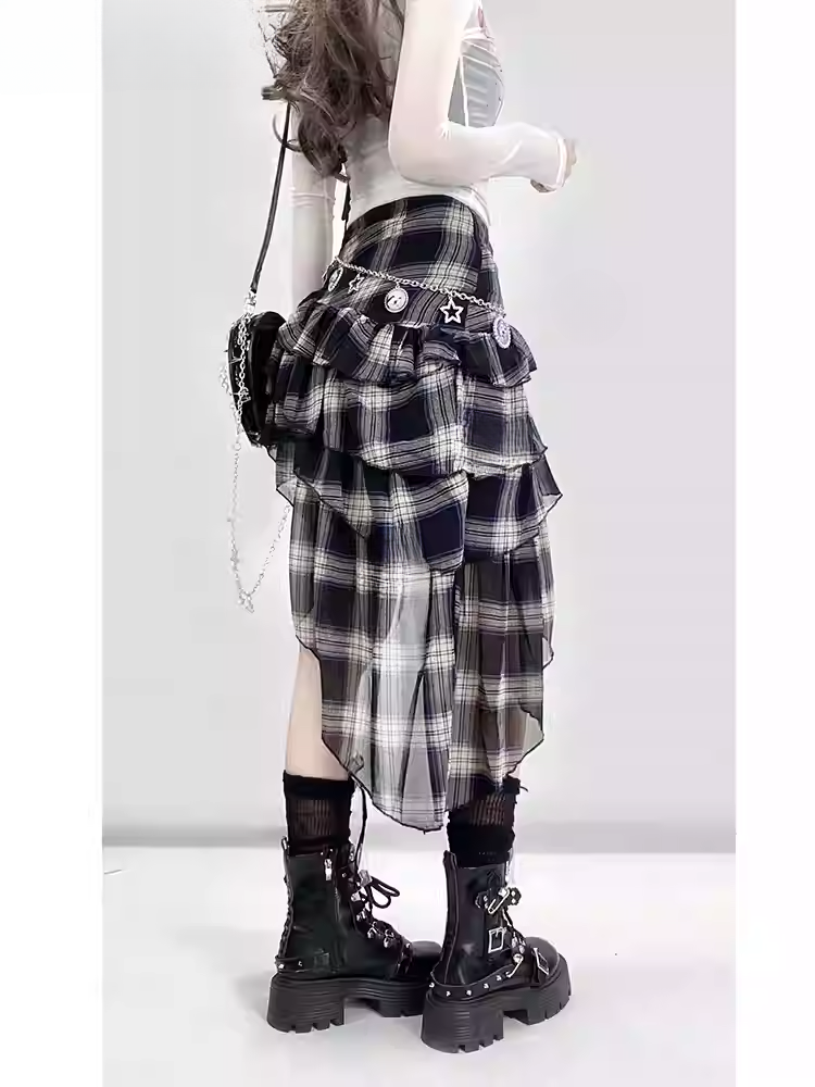 ヴィンテージな白黒チェック柄アシンメトリーヘムスカートで、あなたの内なるキュートさを解き放ちましょう!グラマラスなハイウエストとティアードデザインがスタイルを美しく見せ、ユニークなアシンメトリーヘムが遊び心をプラス。スタイリッシュで遊び心のあるルックにぴったりです。