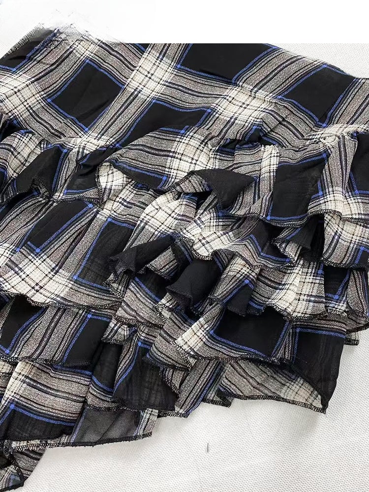 ヴィンテージな白黒チェック柄のアシンメトリーヘムのグラマラスなハイウエストティアードスカート