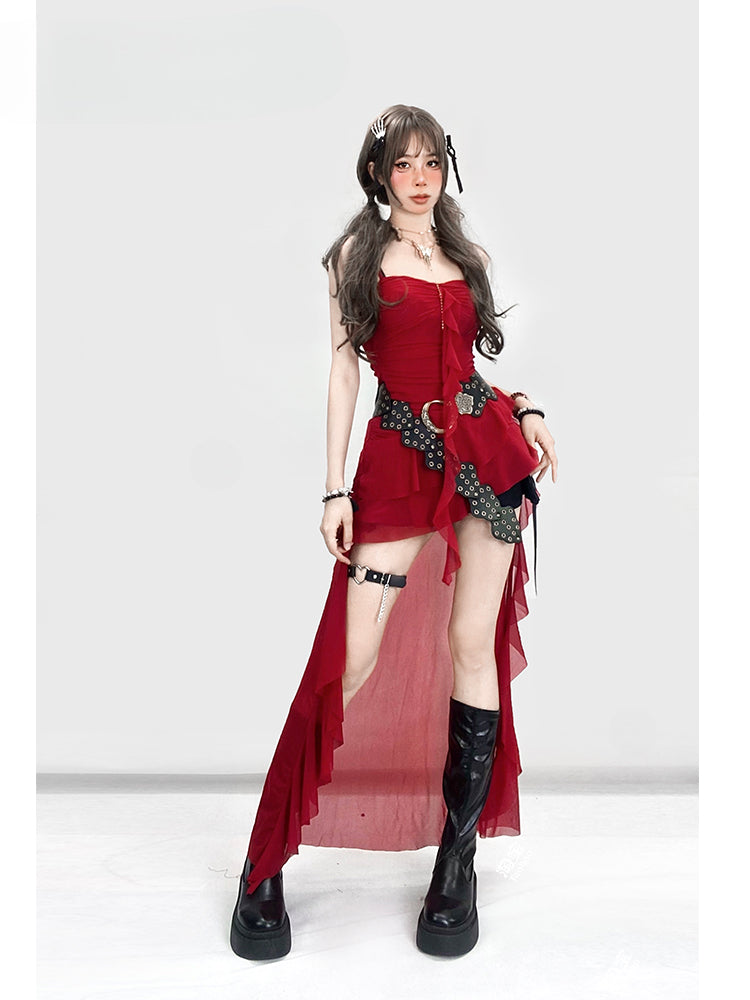 ヴィンテージレッドのアシンメトリーフリルヘムハイローグラマラスキャミドレス