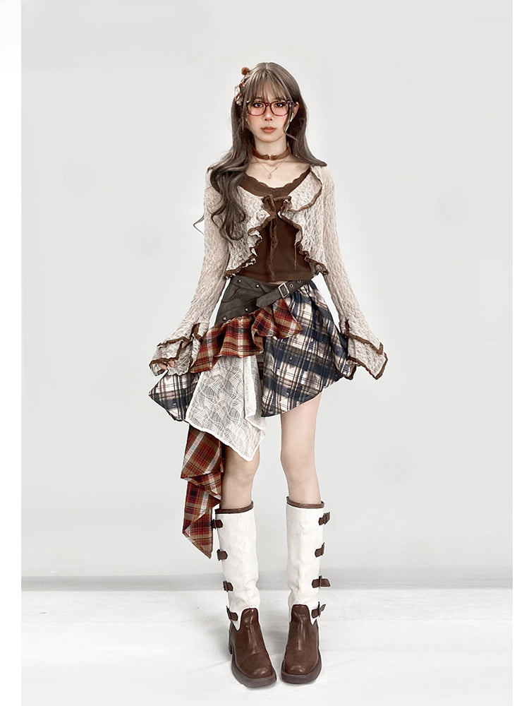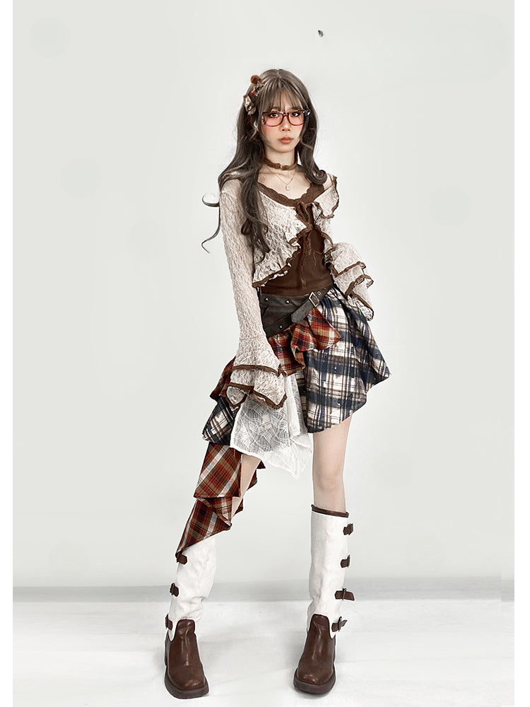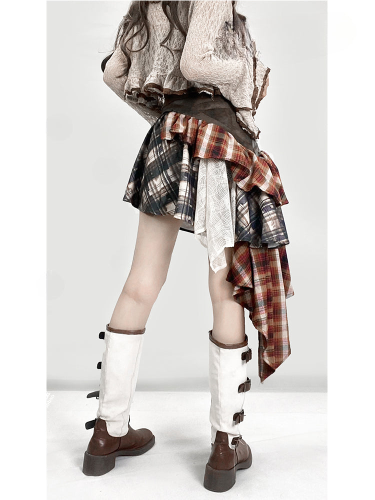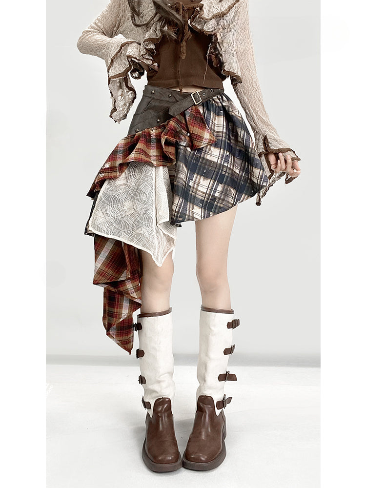ヴィンテージレッドチェック柄ローウエストアシンメトリーヘムグラマラススカート