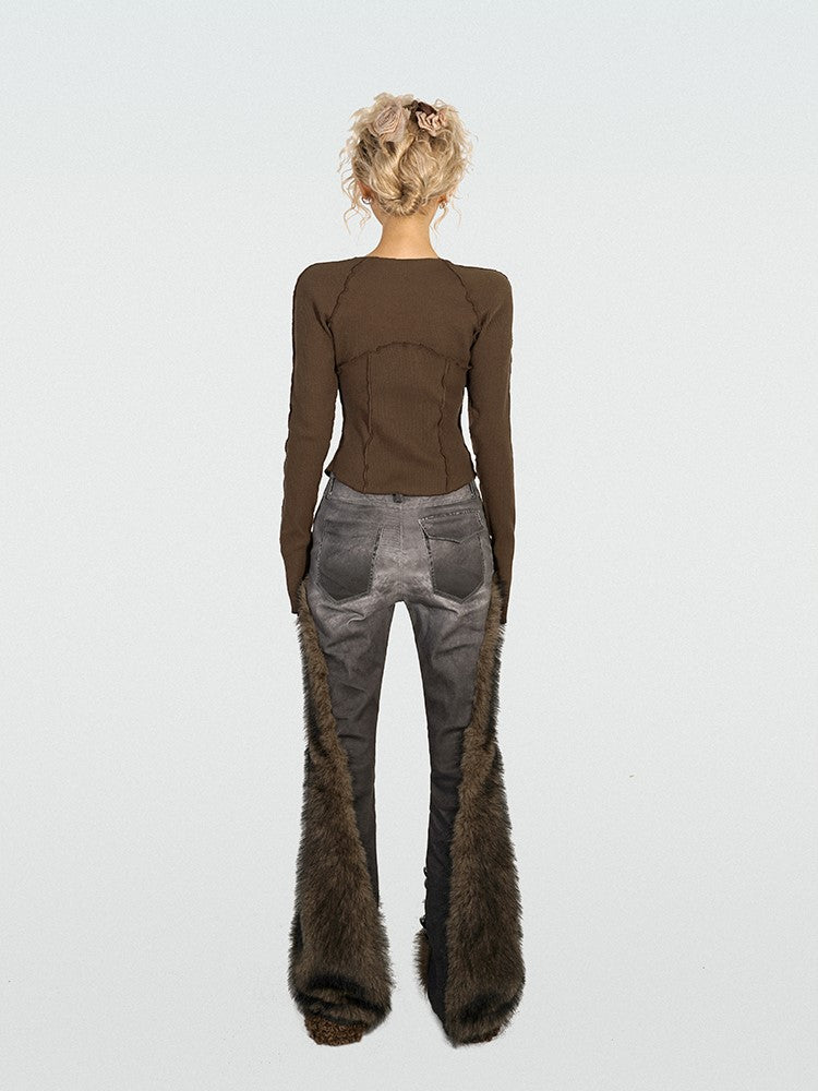 Vintage Top Patch Knit Front Coffee with Crossover Butterfly Off-Shoulder Lace-Up