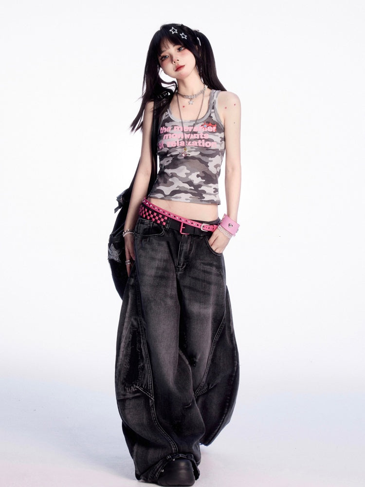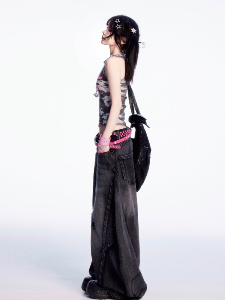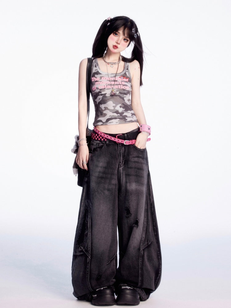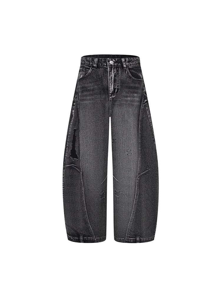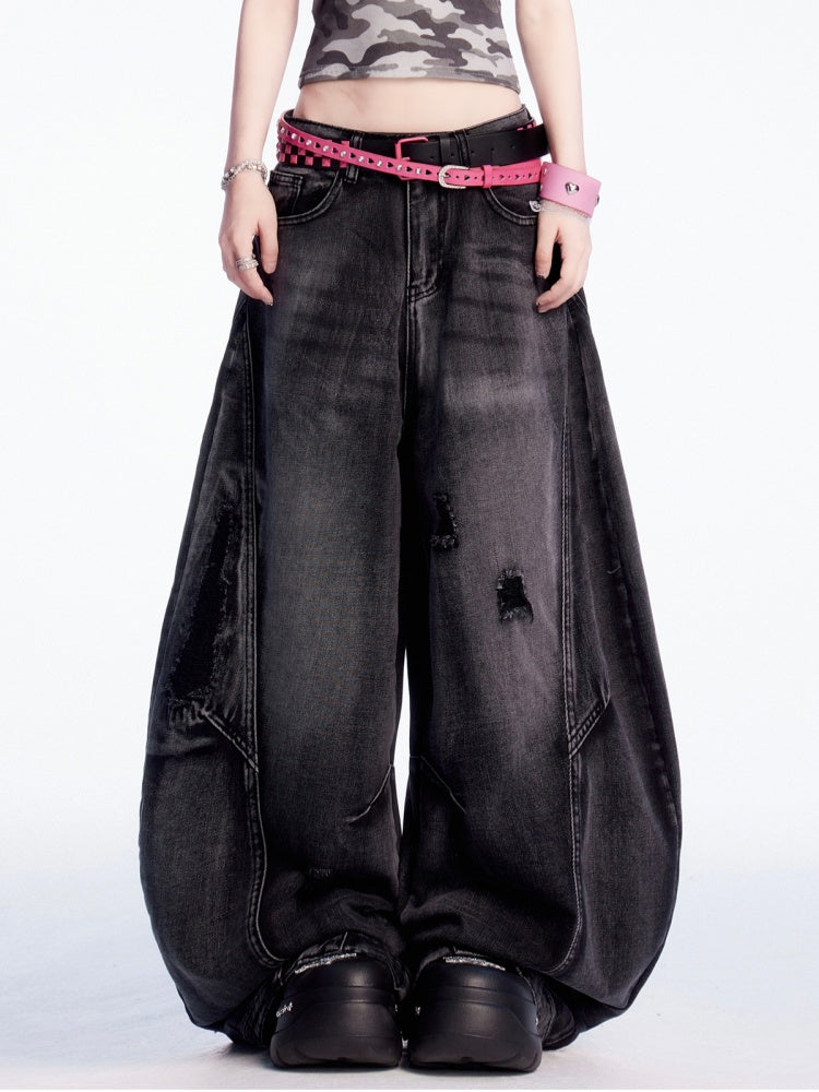 ヴィンテージウエスト、ダメージ加工、穴あきブラック、ローカット、ワイドレッグジーンズ