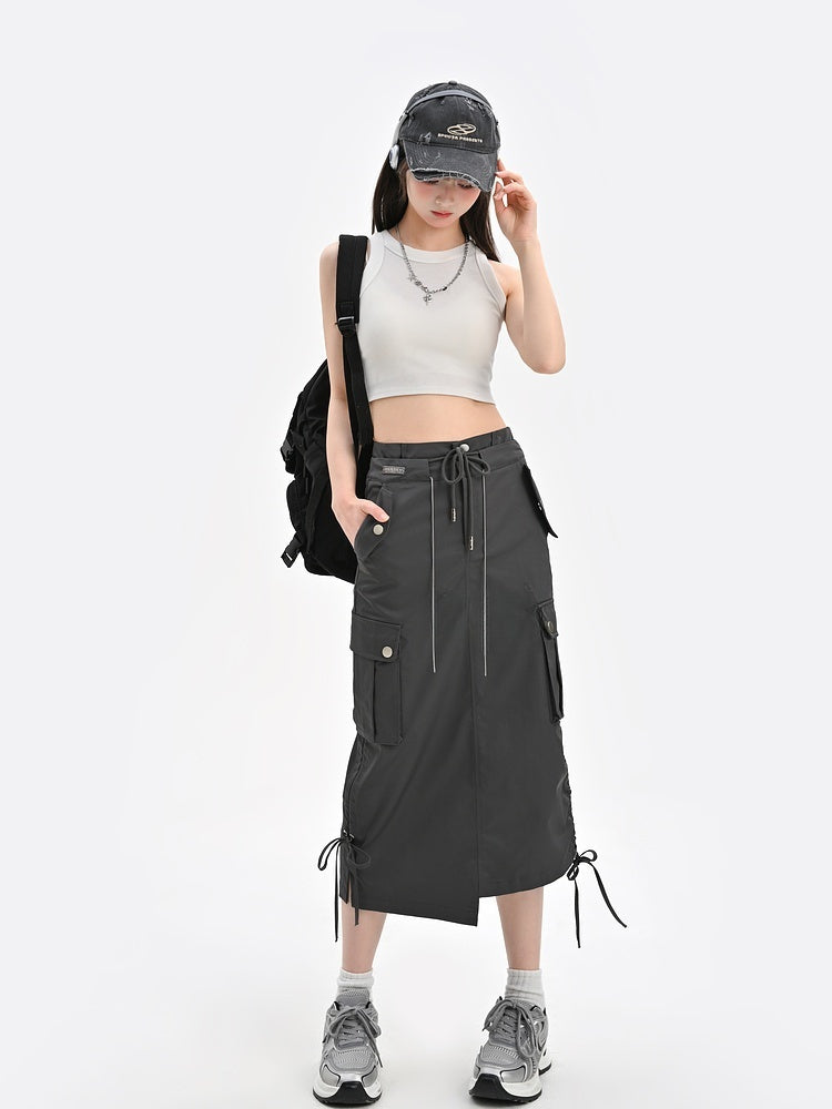 グレーのドローストリングヘムとウエストのアシンメトリーなビタースイートカーゴスカート