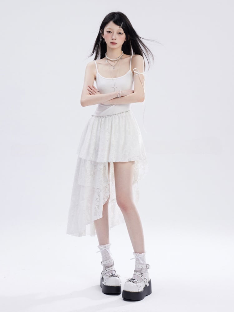 ウエストとホワイトのアシンメトリーウエストラインのレースヘムスリップドレス(チェーン付き)