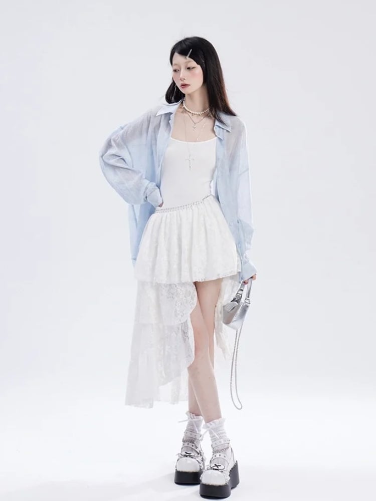 ホワイトのアシンメトリーウエストラインとレースヘムのスリップドレス(ウエストチェーン付き)