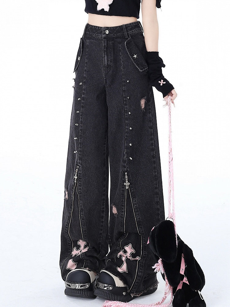 ウエスト ブラックディテール ジーンズ パンクデザイン スタッド ジップ ハイ