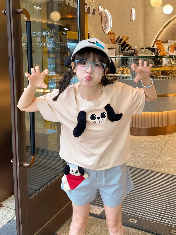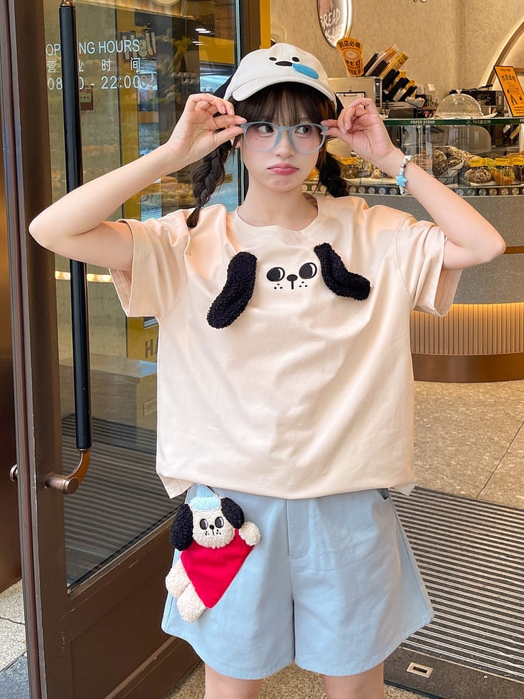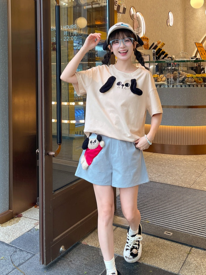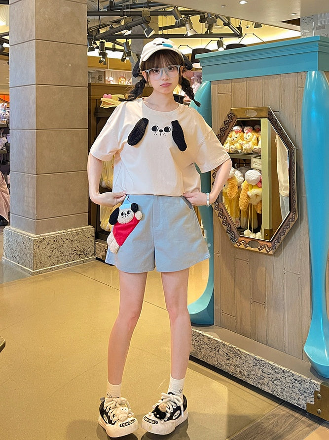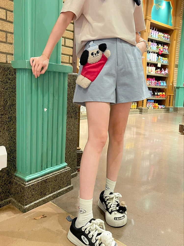 ライトブルーのハイウエスト プラッシュパピーアップリケ ストレートレッグショーツ
