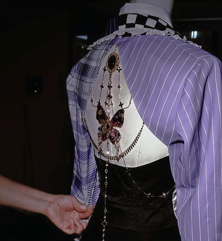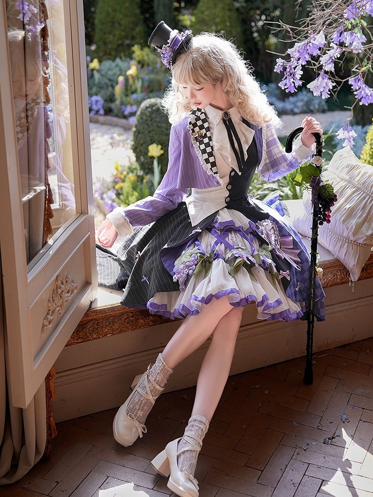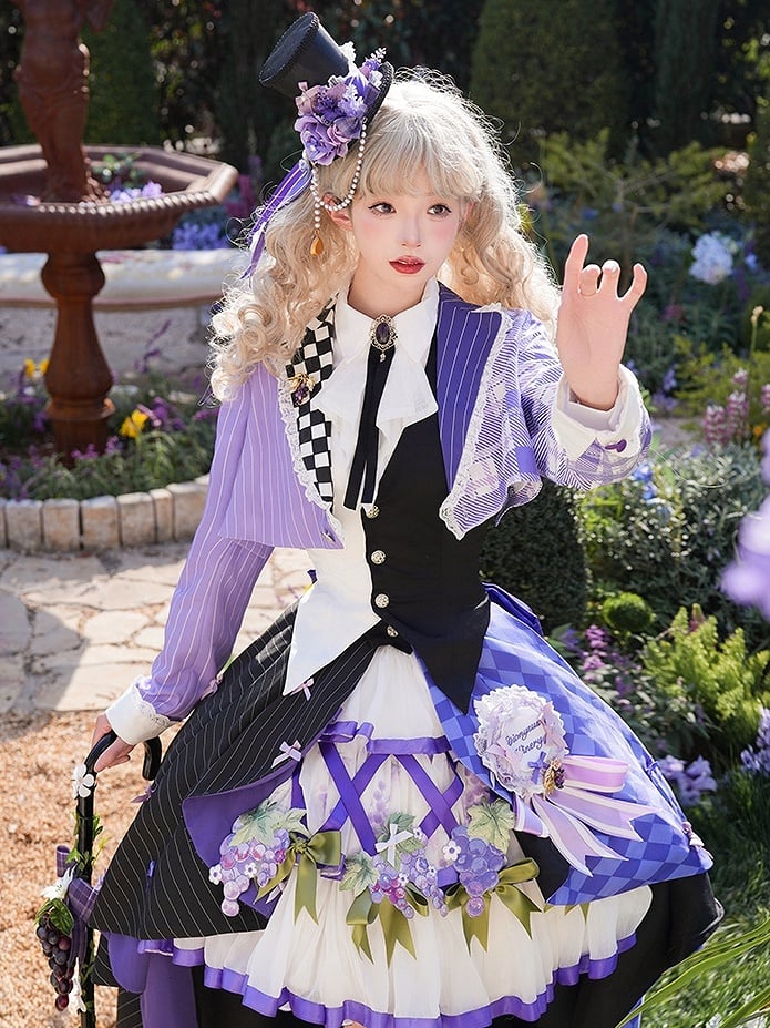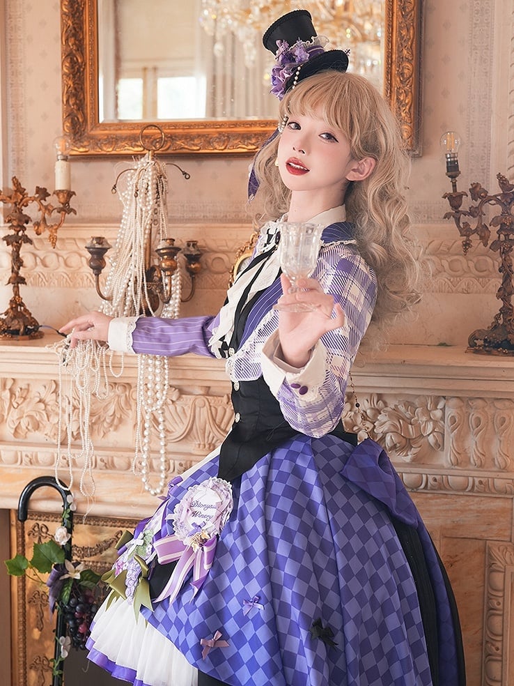 ウエストコートトップス - ブレザー クロップド丈王子セット 半分チェック柄 半分ストライプ パープルロリータ 半分黒 + 半分白 バックレス柄