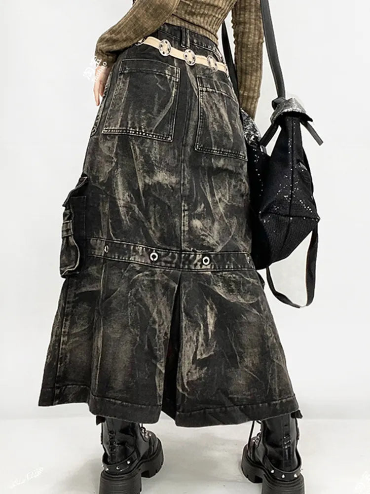 ブラックフェードウォッシュカーゴポケットウェイストランドパンクスカート