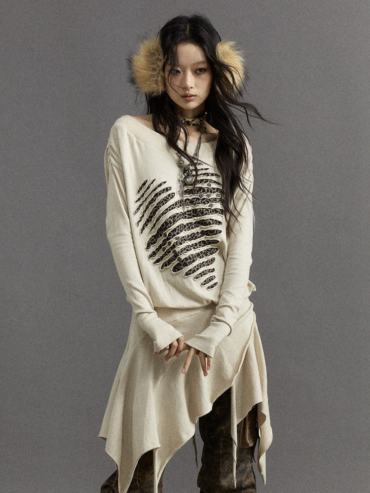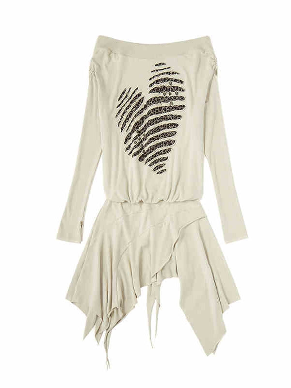 ウェイストランドパンクベージュヒョウ柄ハートアシンメトリーロングスリーブドレス