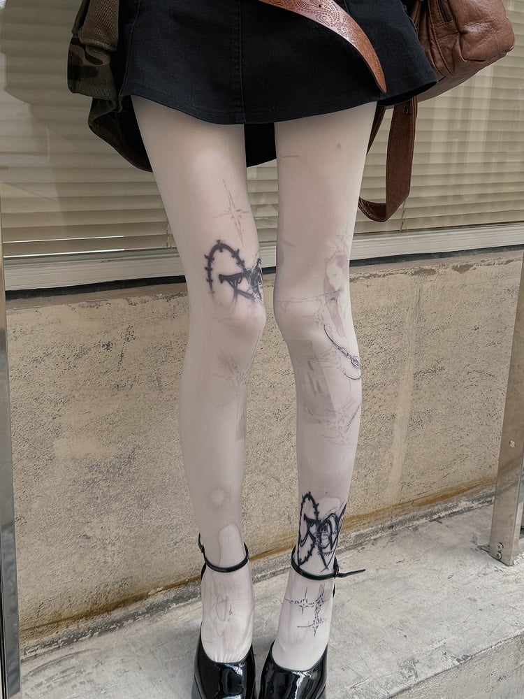 ホワイト 100D パンクプリントタイツ