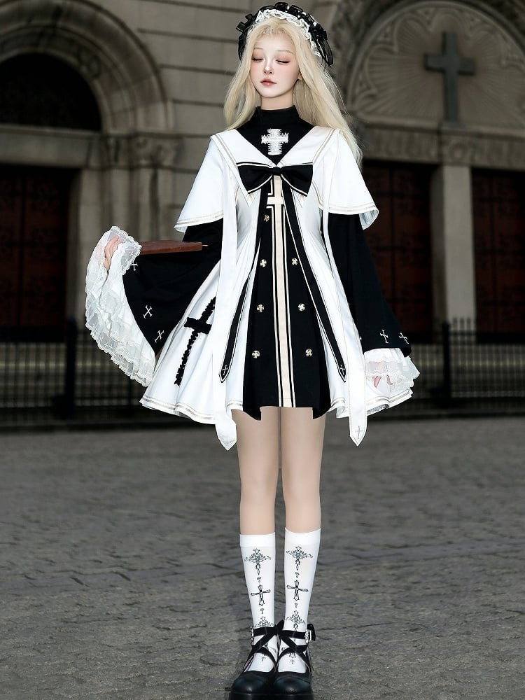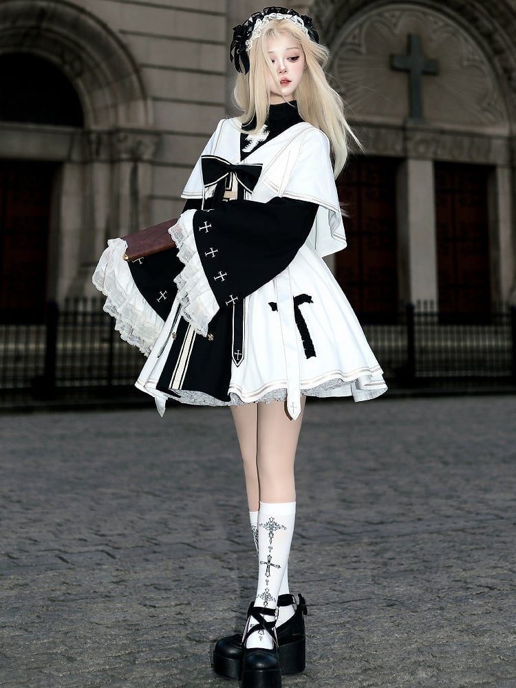 白と黒の修道女ロリータドレスフルセット - ベルスリーブ修道女ドレス + 白ケープ + 黒リボンアクセサリー