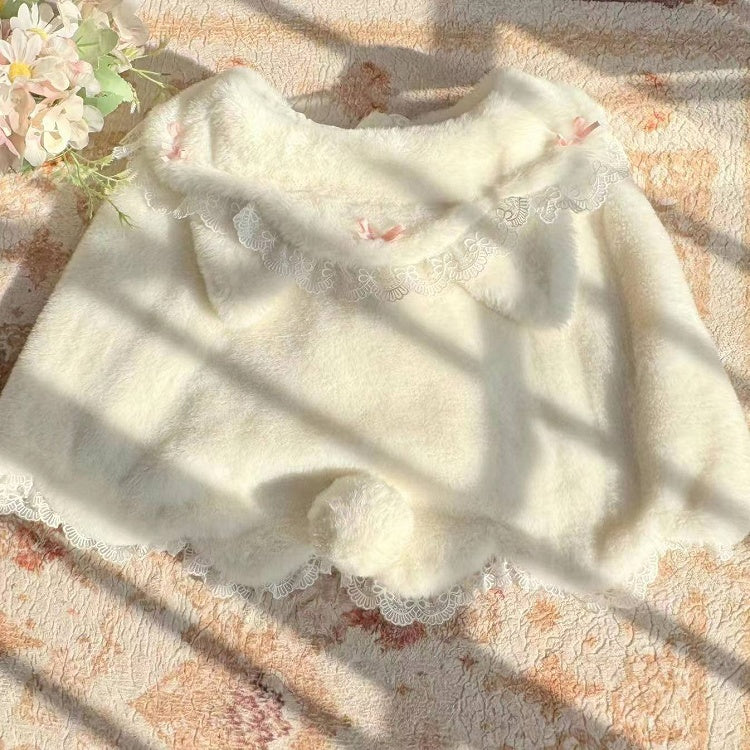 Sweet Lolita White and Pink Winter Plush Cape with Bunny / Kitty Ears