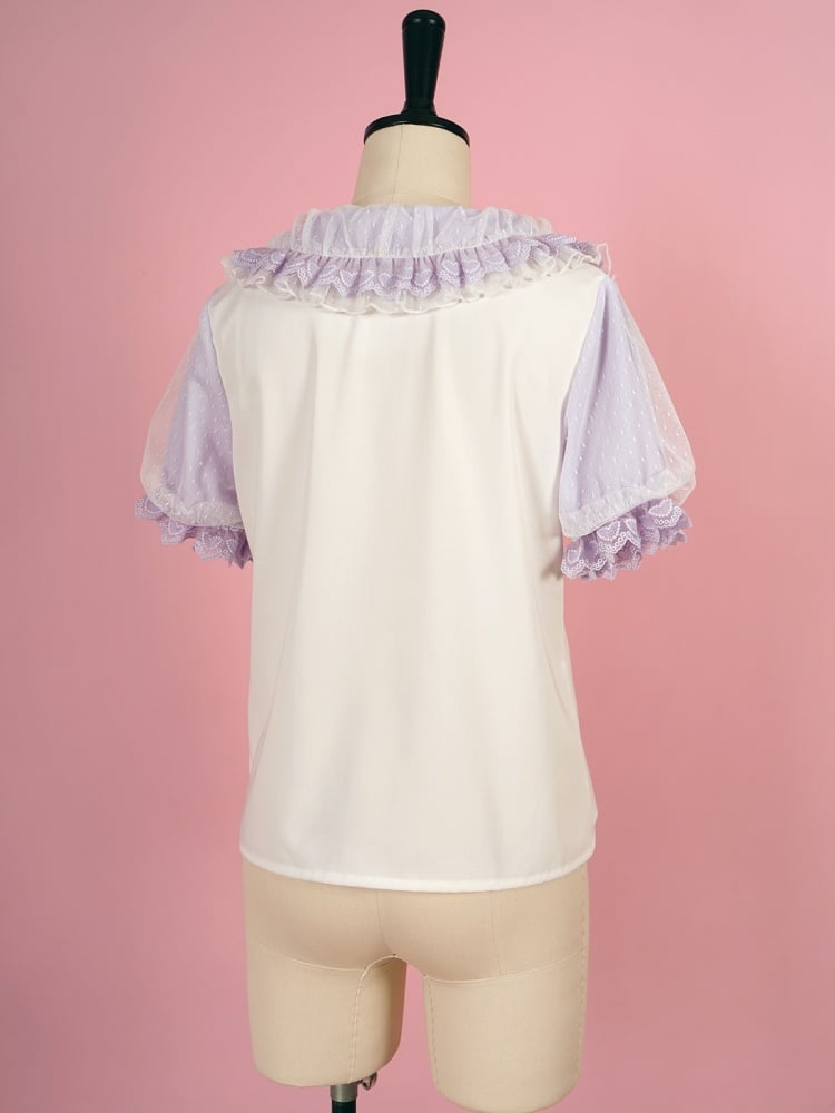 ホワイトとパープルのフリルトリム、ピーターパンカラーの半袖ブラウス