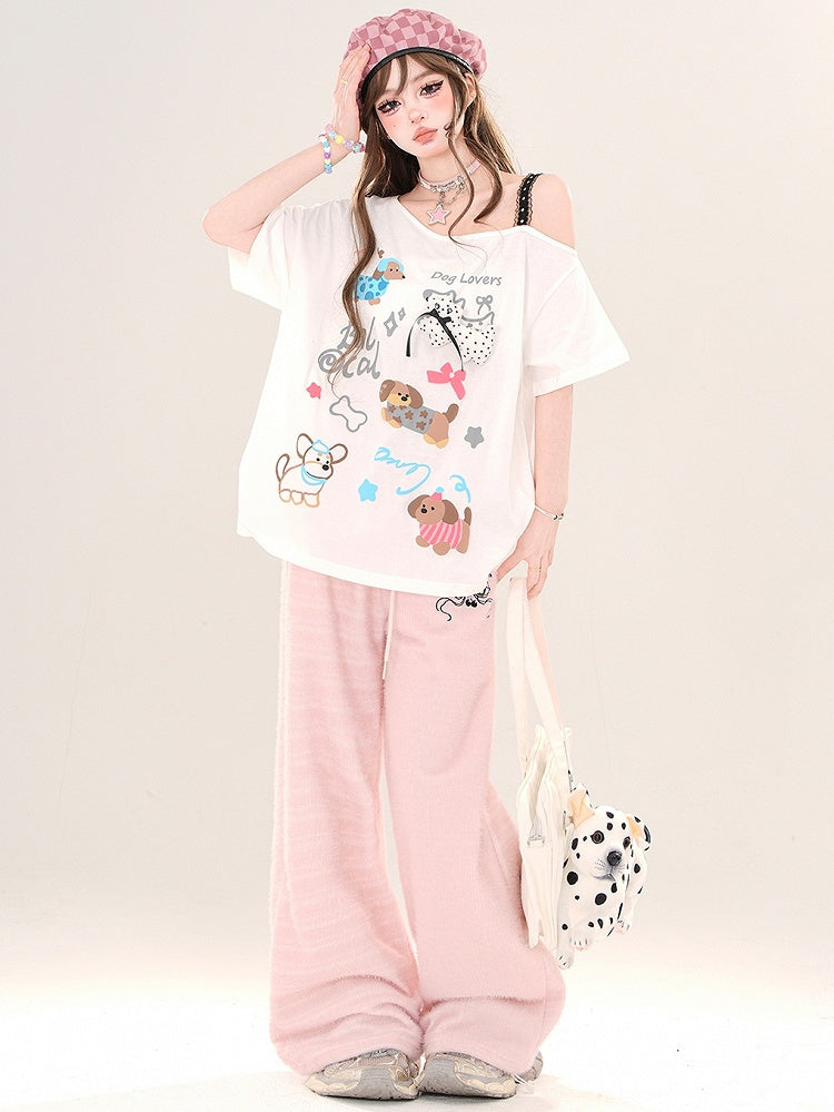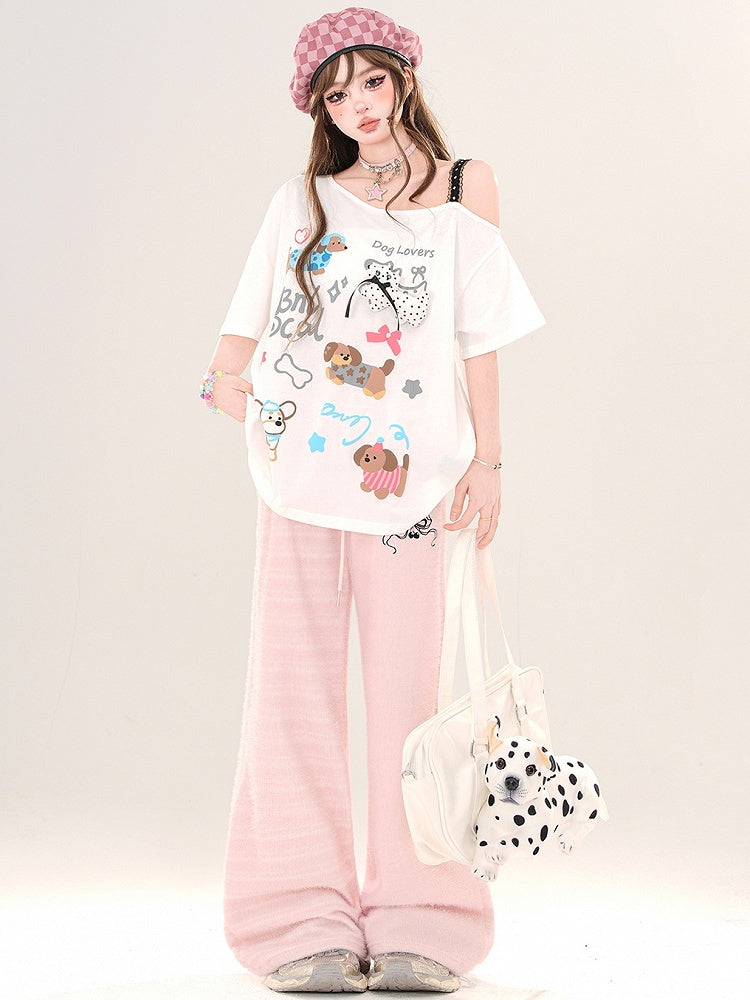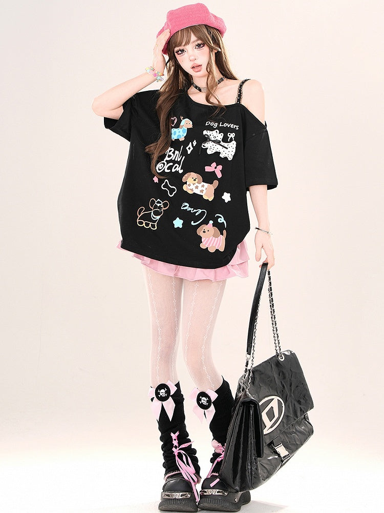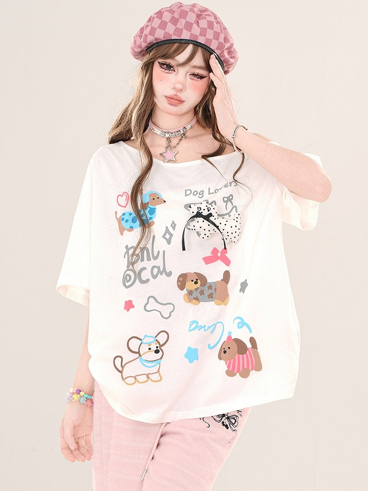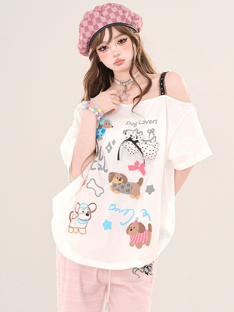 ホワイト/ブラックの漫画の子犬のアシンメトリーネックラインのルーズTシャツ