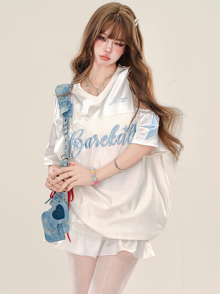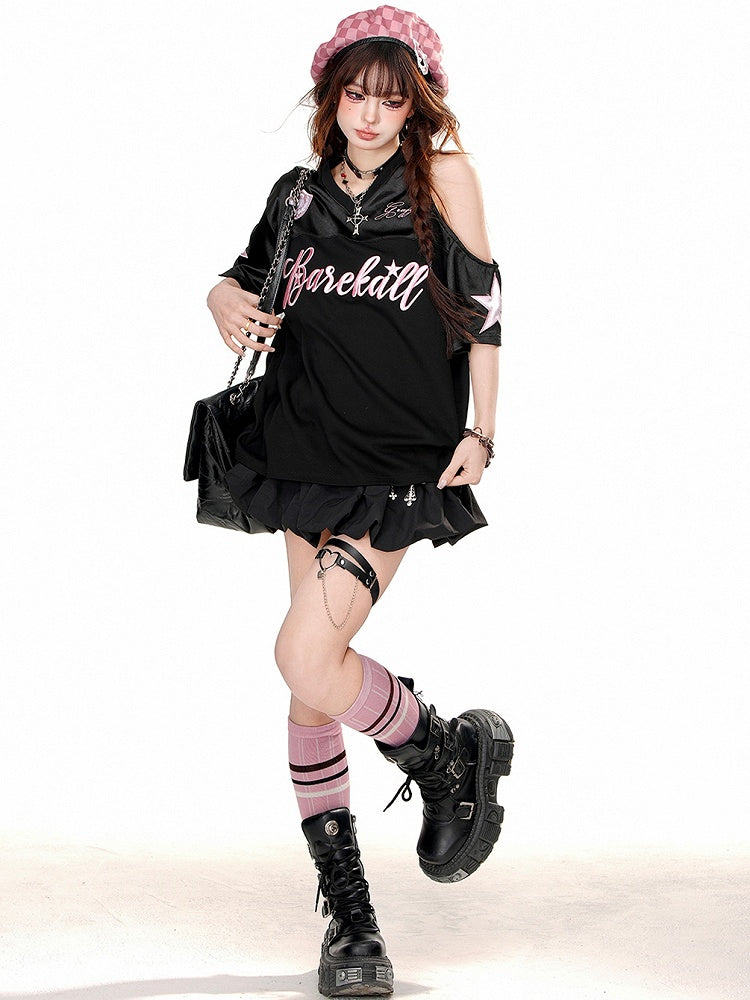 ホワイト/ブラックの文字が入ったカットアウトショルダーVネックのスポーティTシャツは、快適さとスタイリッシュさの両方を求める方にぴったりです。カットアウトデザインが遊び心をプラスし、Vネックとスポーティなルックスがどんなシーンにも合わせやすい万能アイテムです。このシャツでキュートな一面をアピールしましょう!