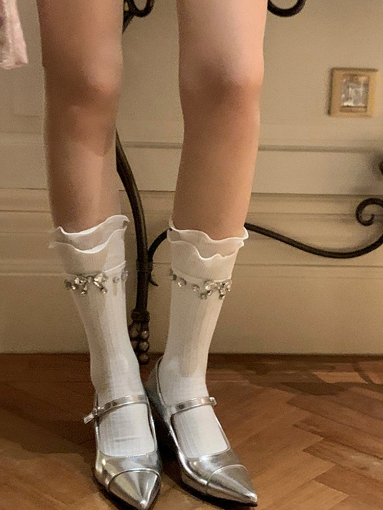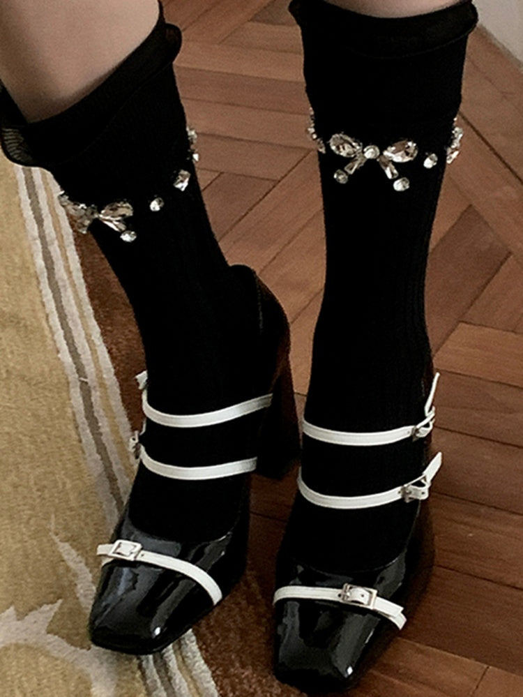ホワイトブラックラインストーンリボン付きカーフソックス