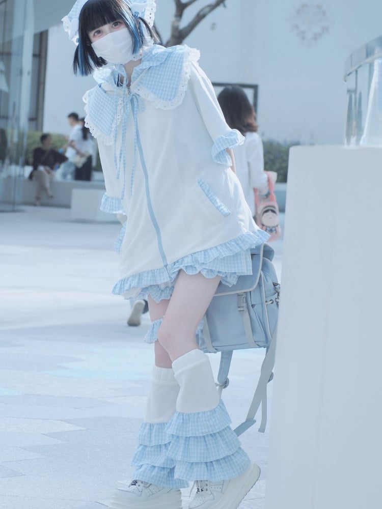 ホワイトブルーのウサギの耳デザインのフード付きジャケットとフリーカラー