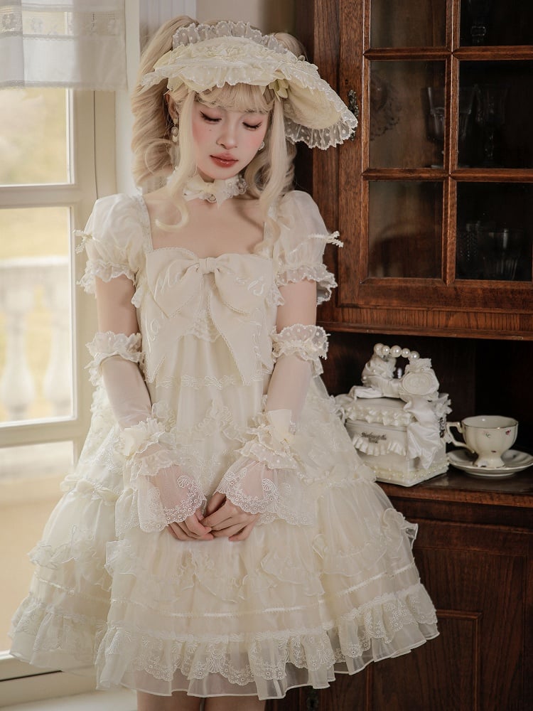ホワイト刺繍のリボンが入ったクリーミーなロリータドレス。袖は大きく、ショート丈のパフネックライン。