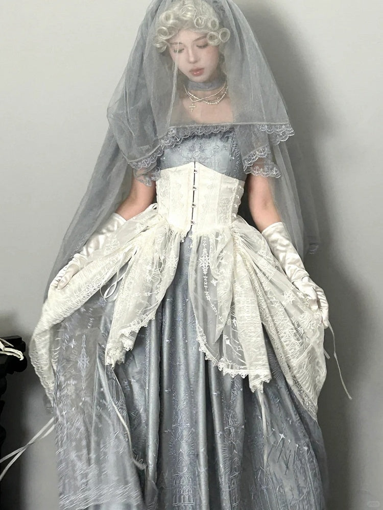ドローストリングデザインの大聖堂刺繍オーバーレイ付きホワイトゴシックロリータコルセットベルト