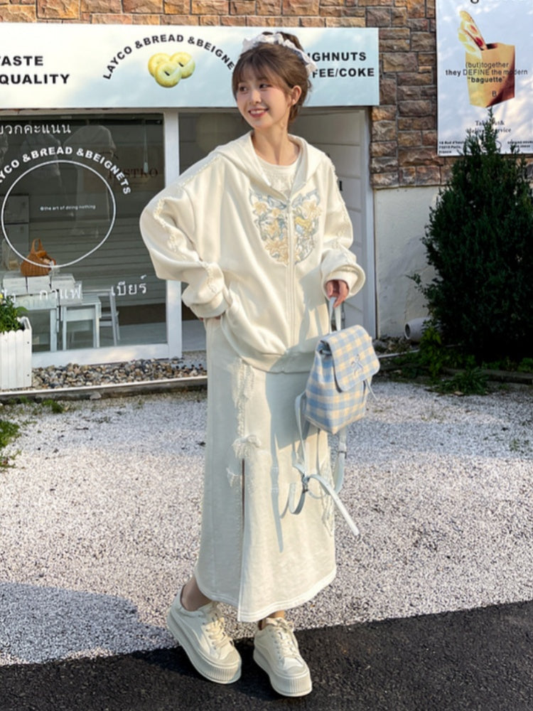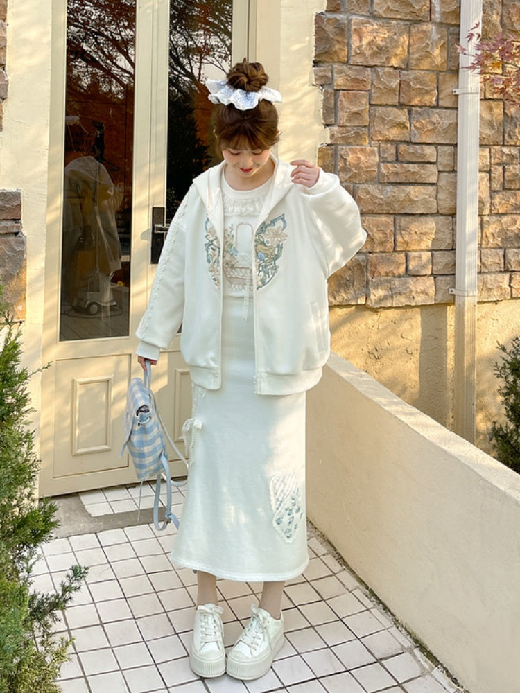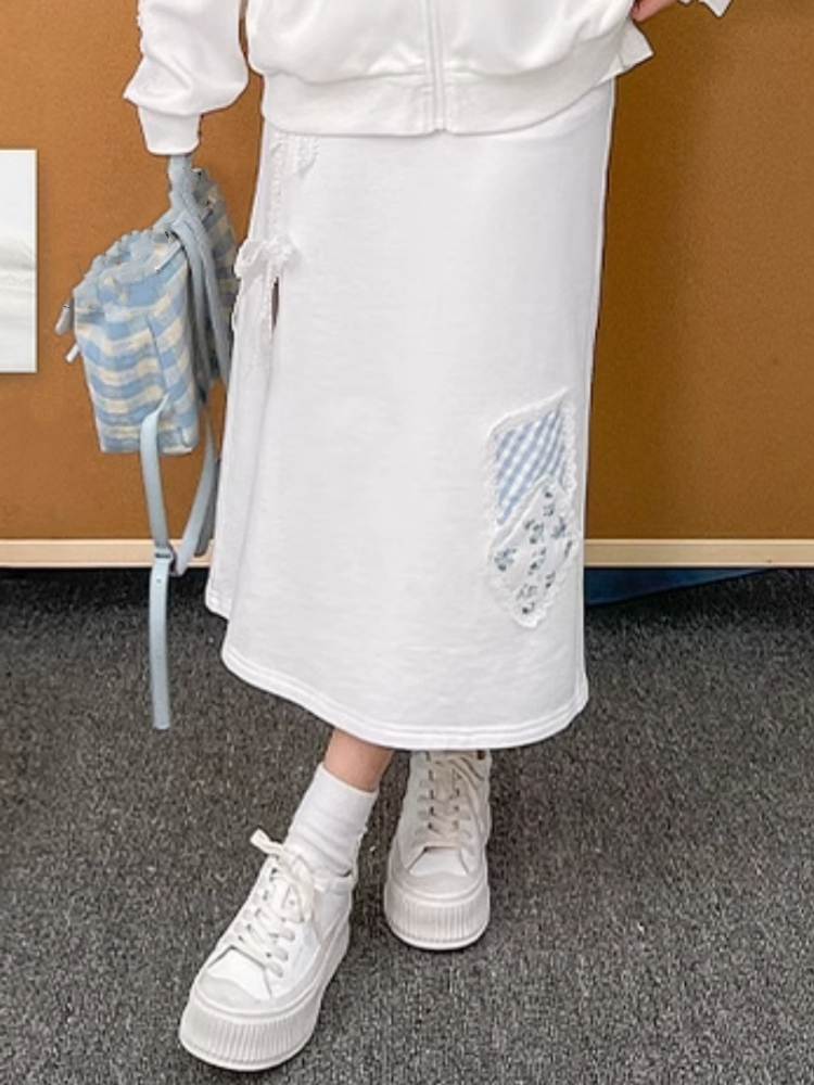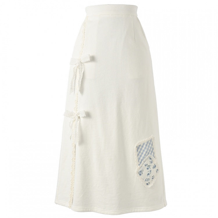 ホワイトレースリボンサイドスリットフローラルアップリケスカート