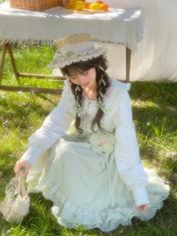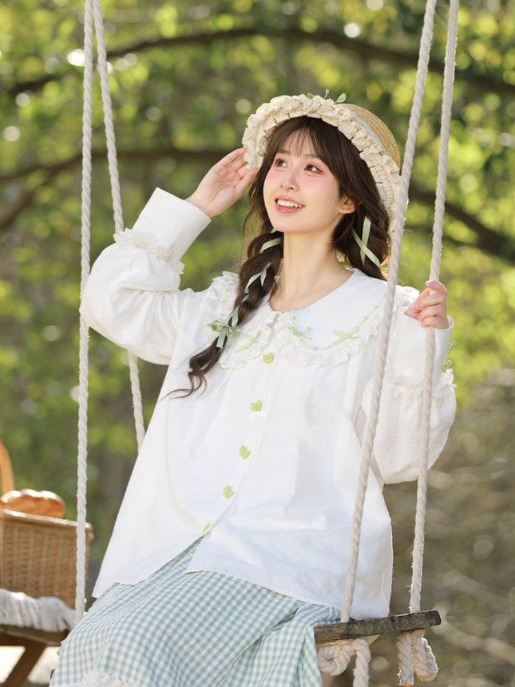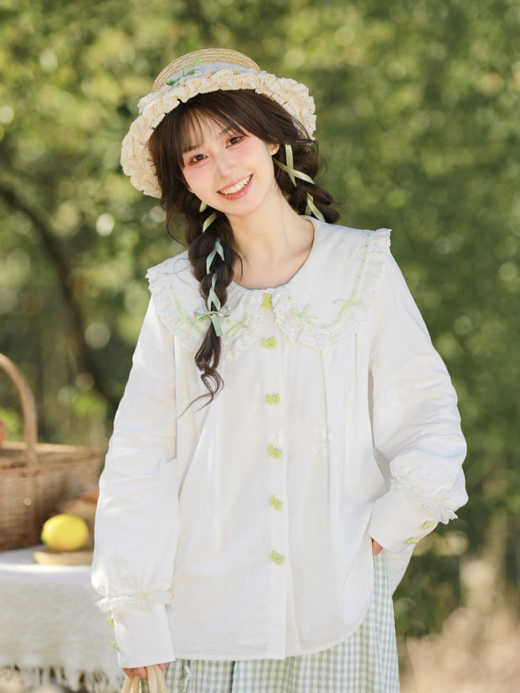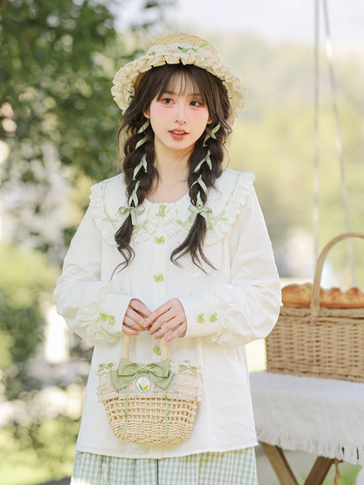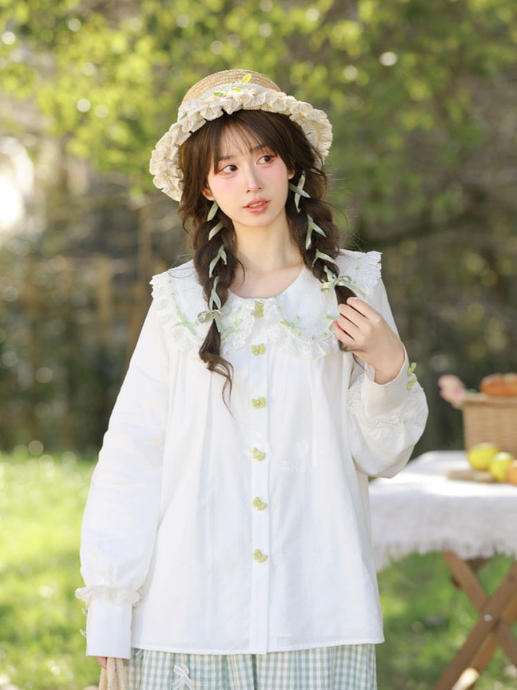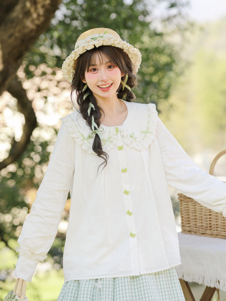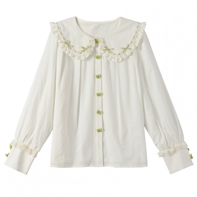 ホワイトレーストリム、丸みのあるフラットカラー、グリーンのリボンボタンブラウス