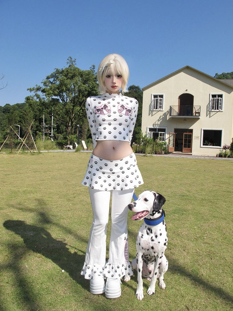 ホワイト ローウエスト パウ柄 スカート フレアパンツ