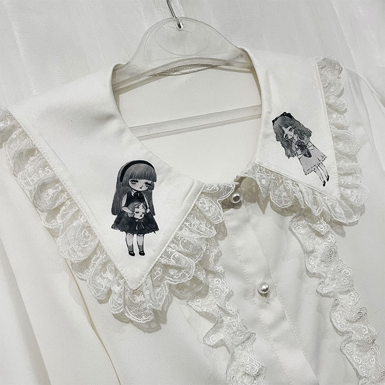 ホワイト王子ロリータドールプリントフラットカラー長袖シャツ