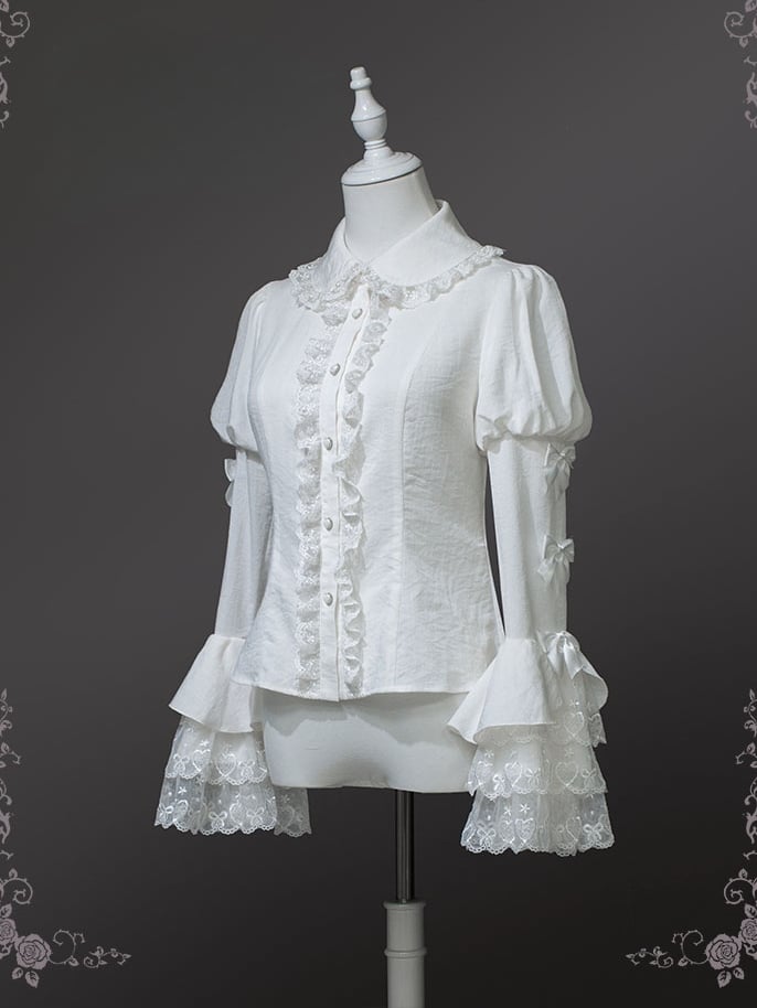 ホワイトピーターパンカラーロングベルスリーブシャツレーストリム