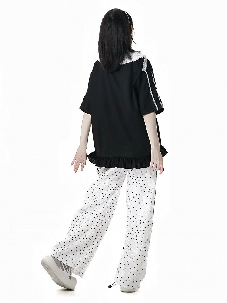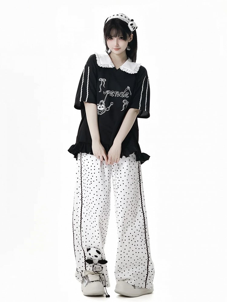 パンダのぬいぐるみ付きホワイト水玉模様コットンストレートレッグパンツ