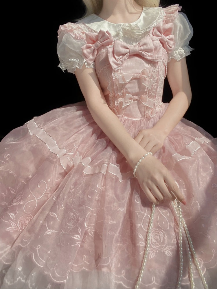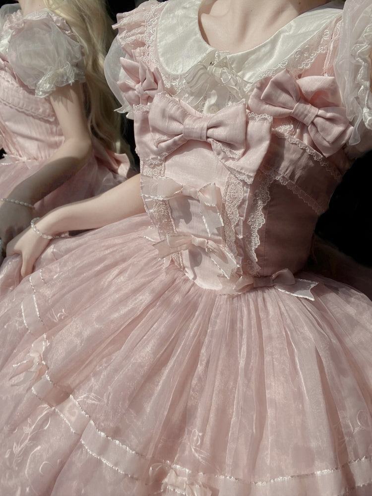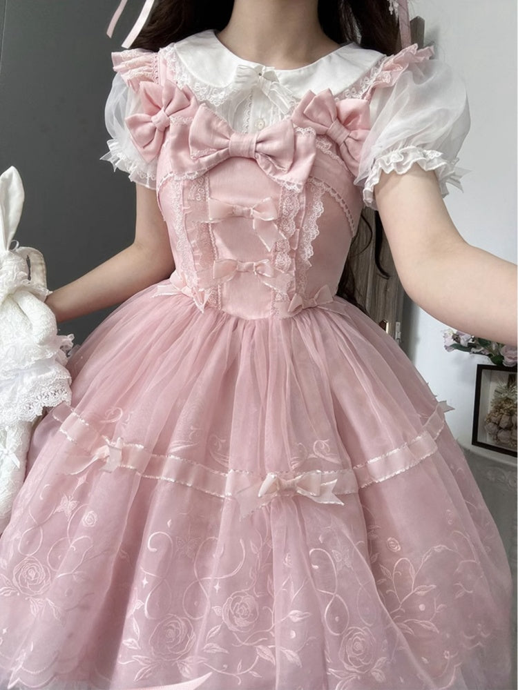 ピンクと白のオールドスクールロリータファッションドレス、蝶結びディテール、ロリータJSKセット