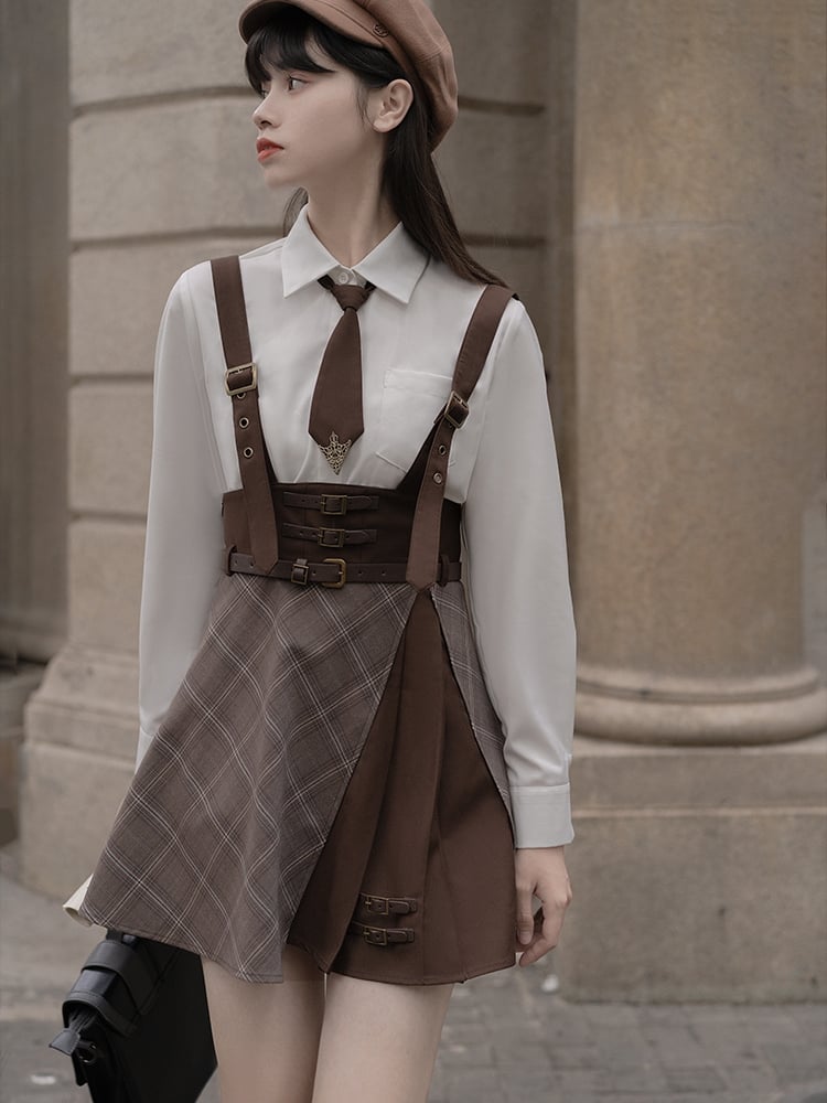 ホワイトリアクションスカート シャツ サスペンダー ブラウンオーバーオール 探偵マイラール プレッピー/チェック柄 リトル