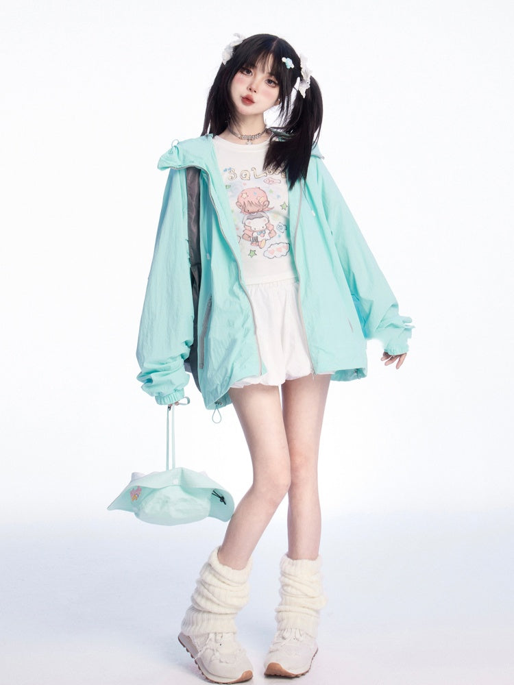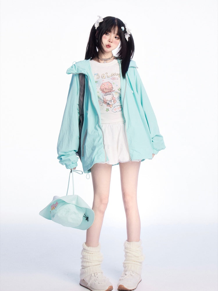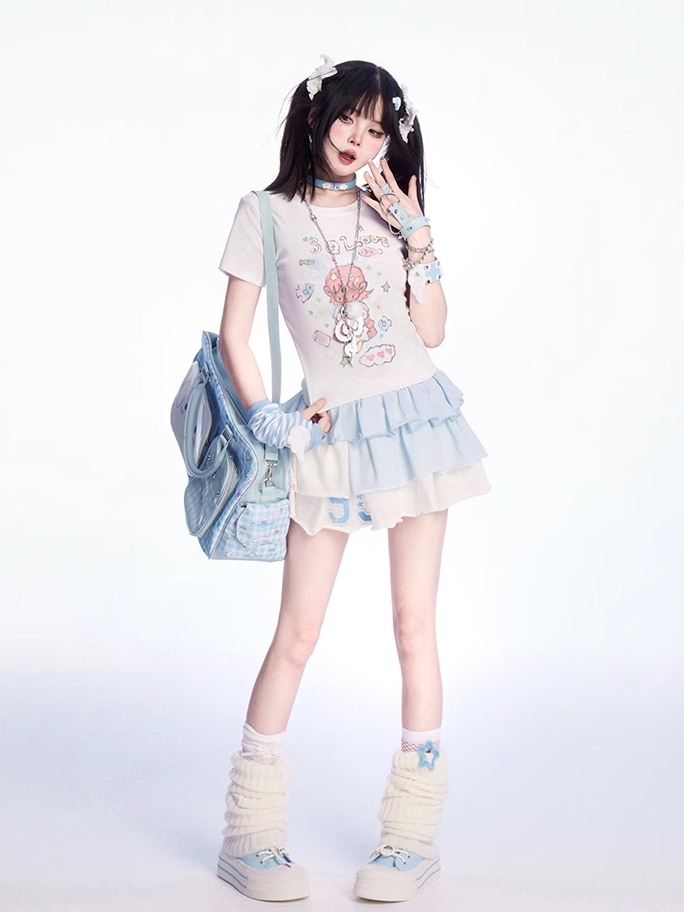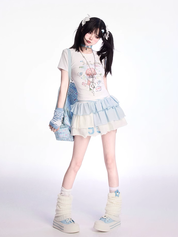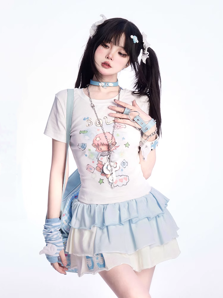ホワイトラウンドネックかわいい漫画プリントTシャツ