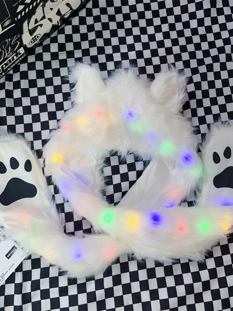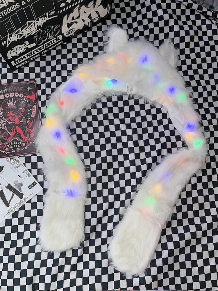 LEDライト付きホワイトシャギースカーフグローブ&ハットオールインワン