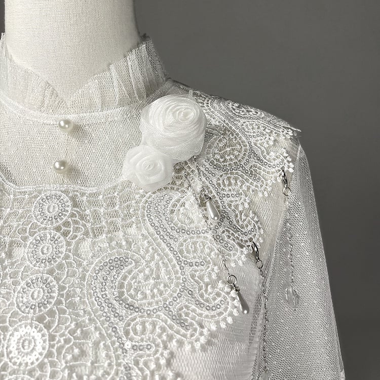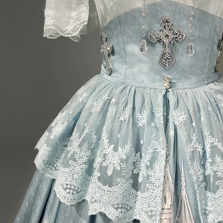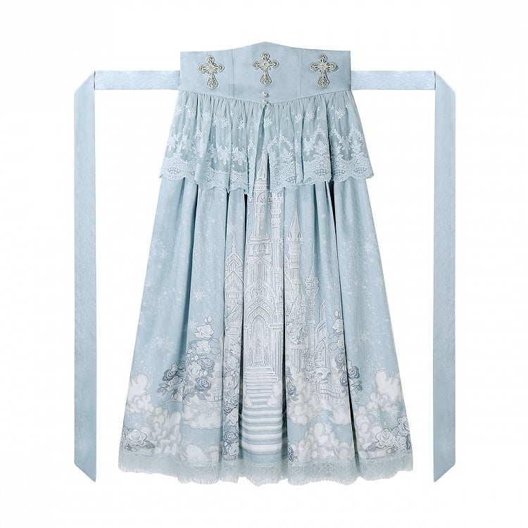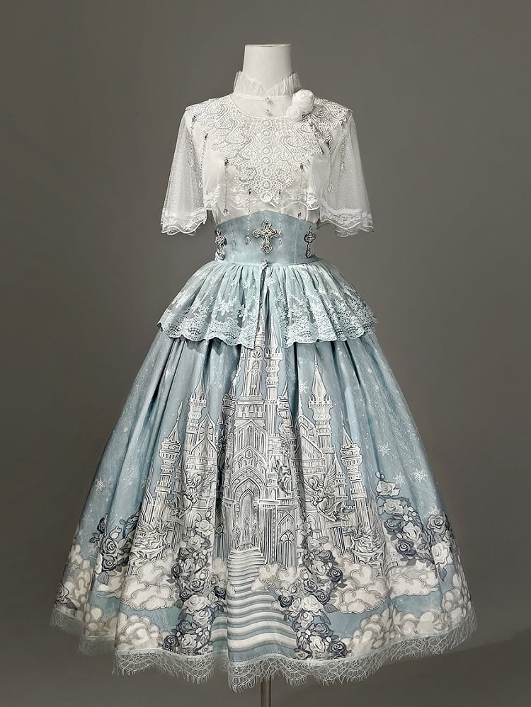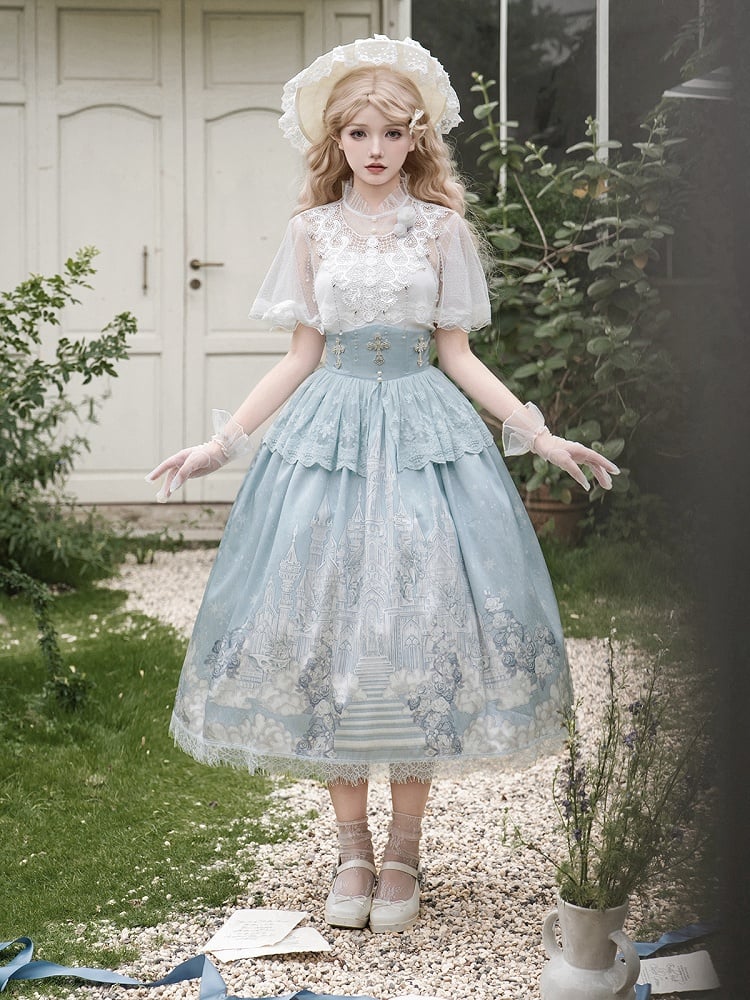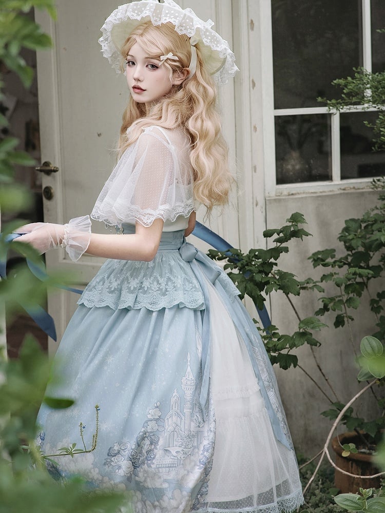 ホワイトキャミソールトップ + チュールケープ + キャッスルプリントブルーハイウエストスカート エレガントクラシックロリータフルセット
