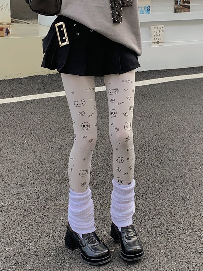 ホワイトのスイートキティハートスタープリントカートゥーンタイツ