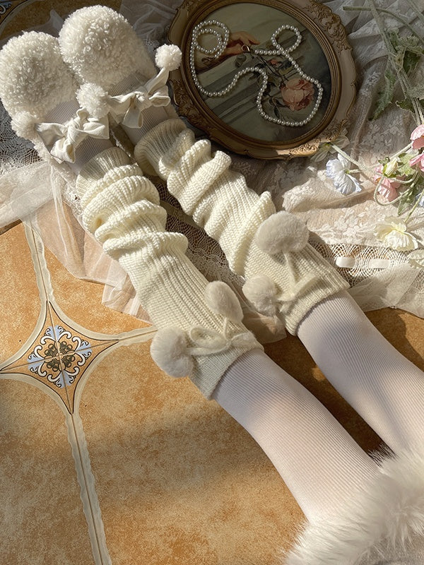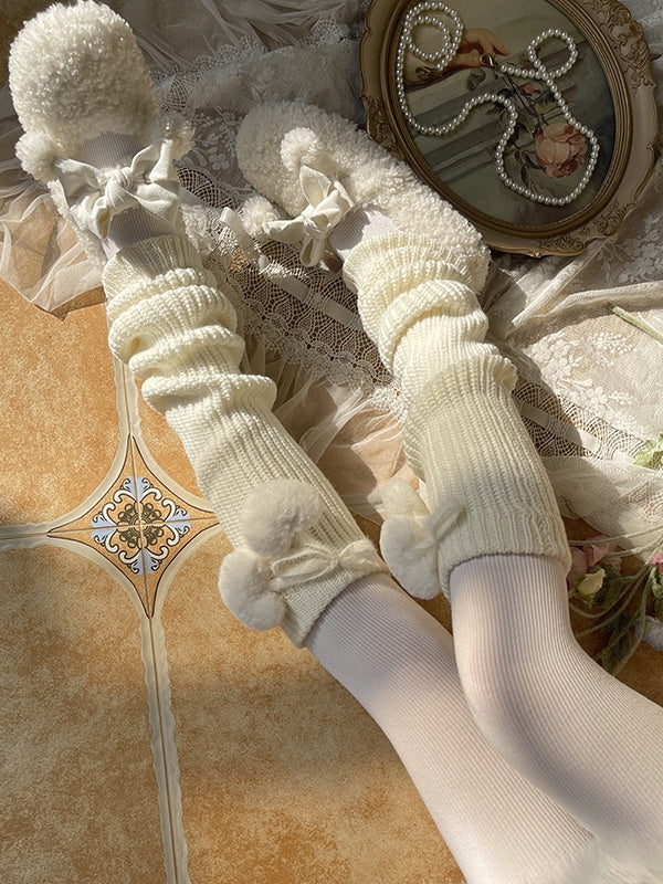 ハート型ポンポン付きホワイトスイートニットレッグウォーマー